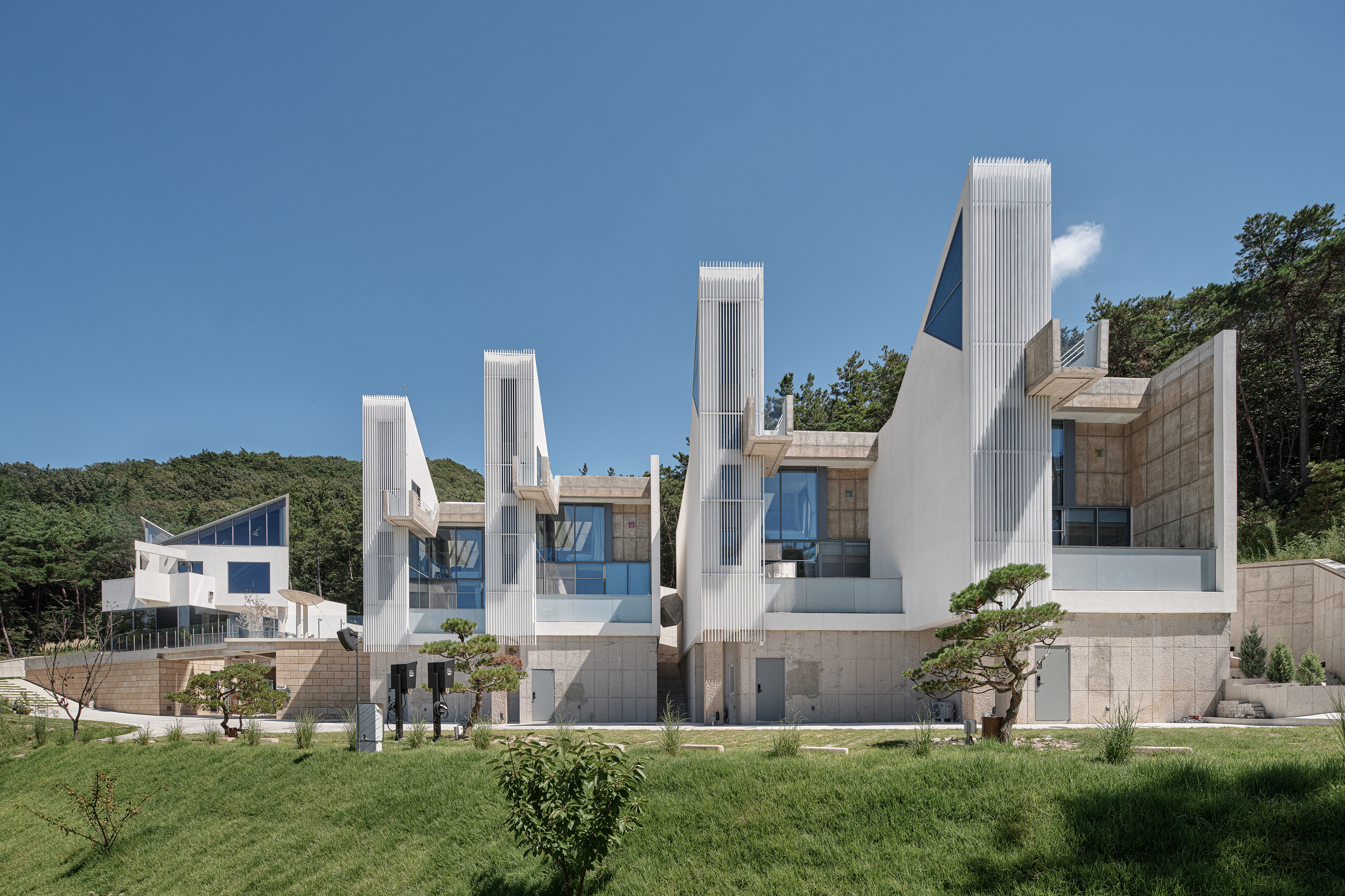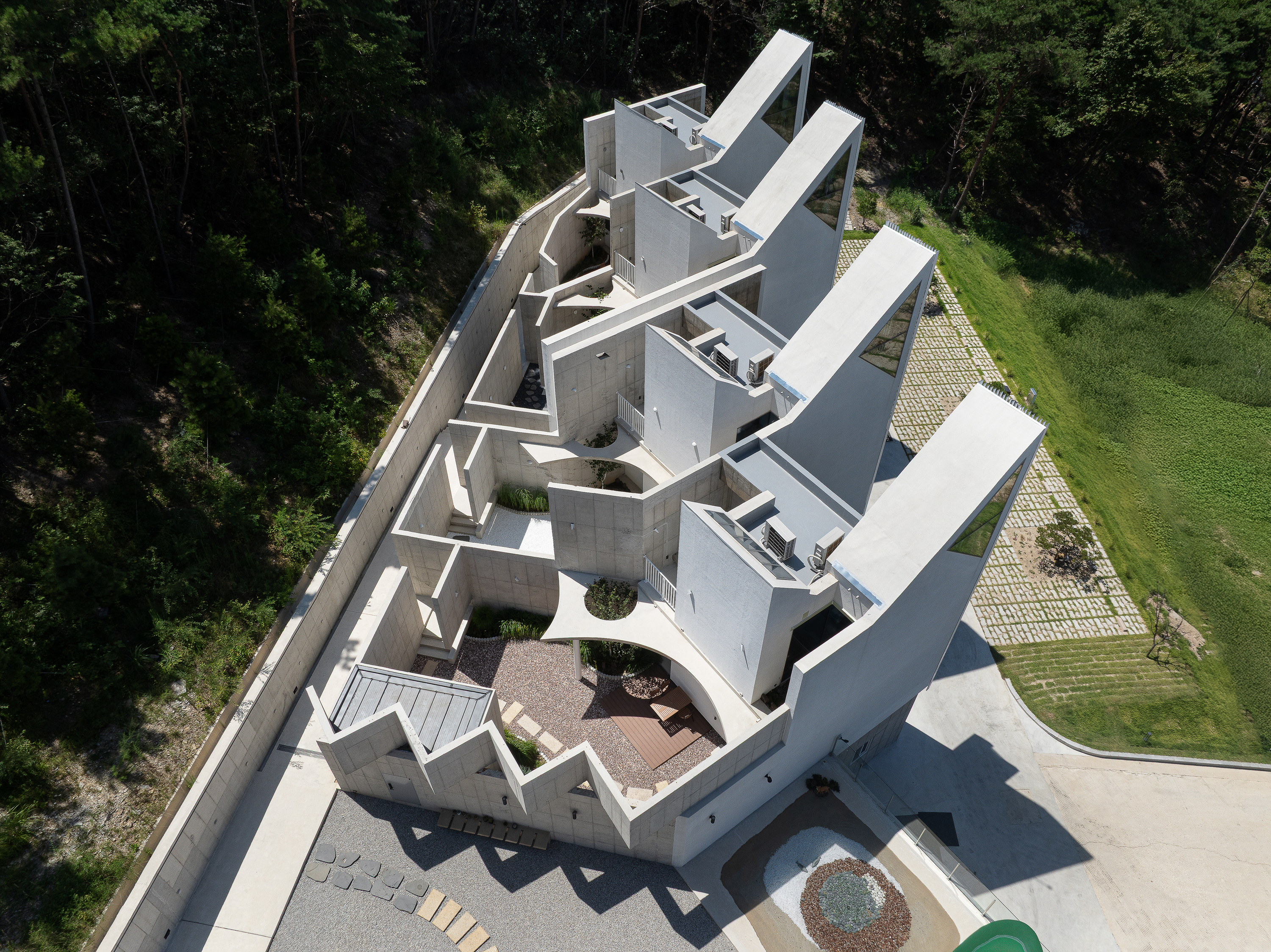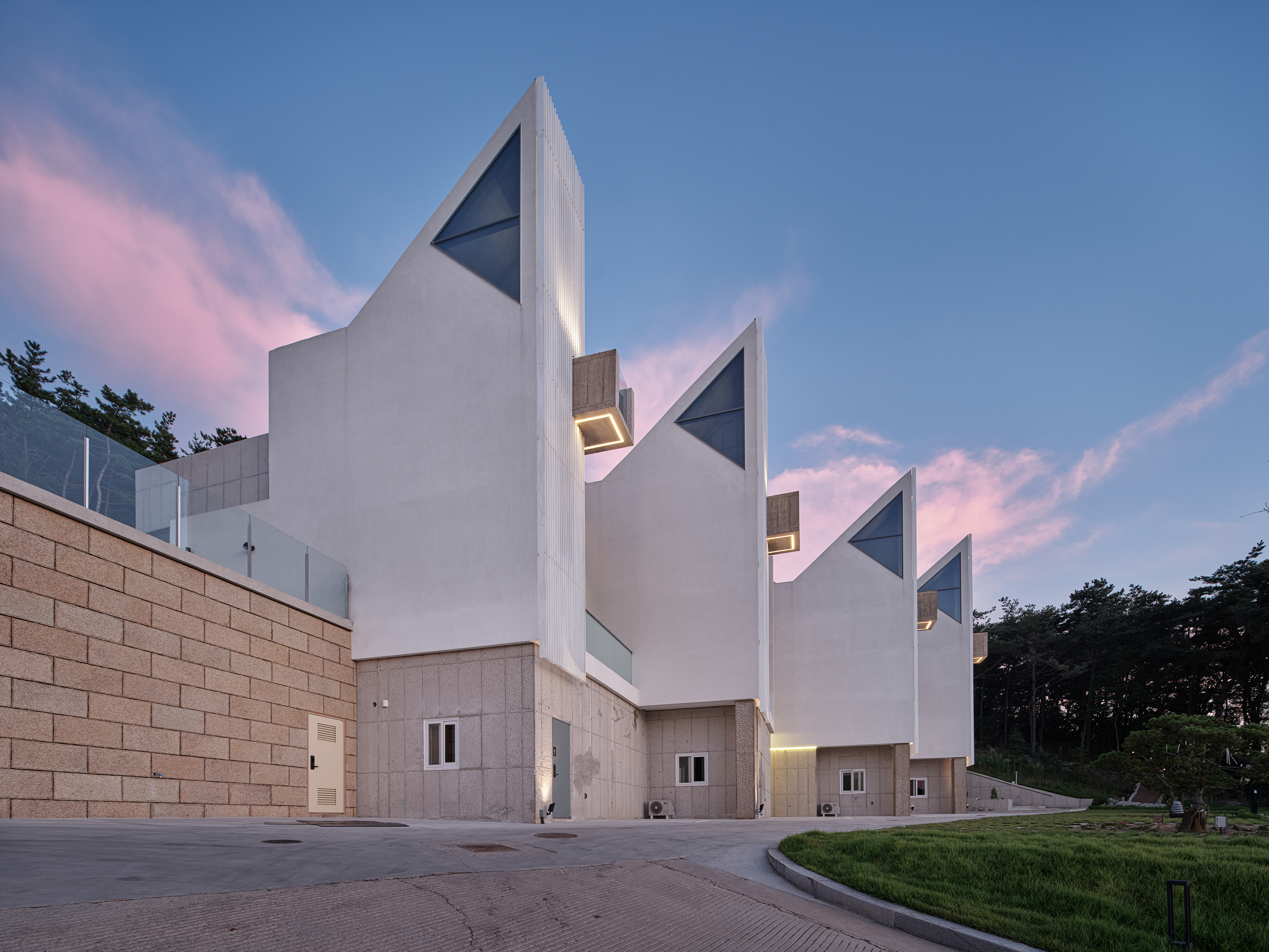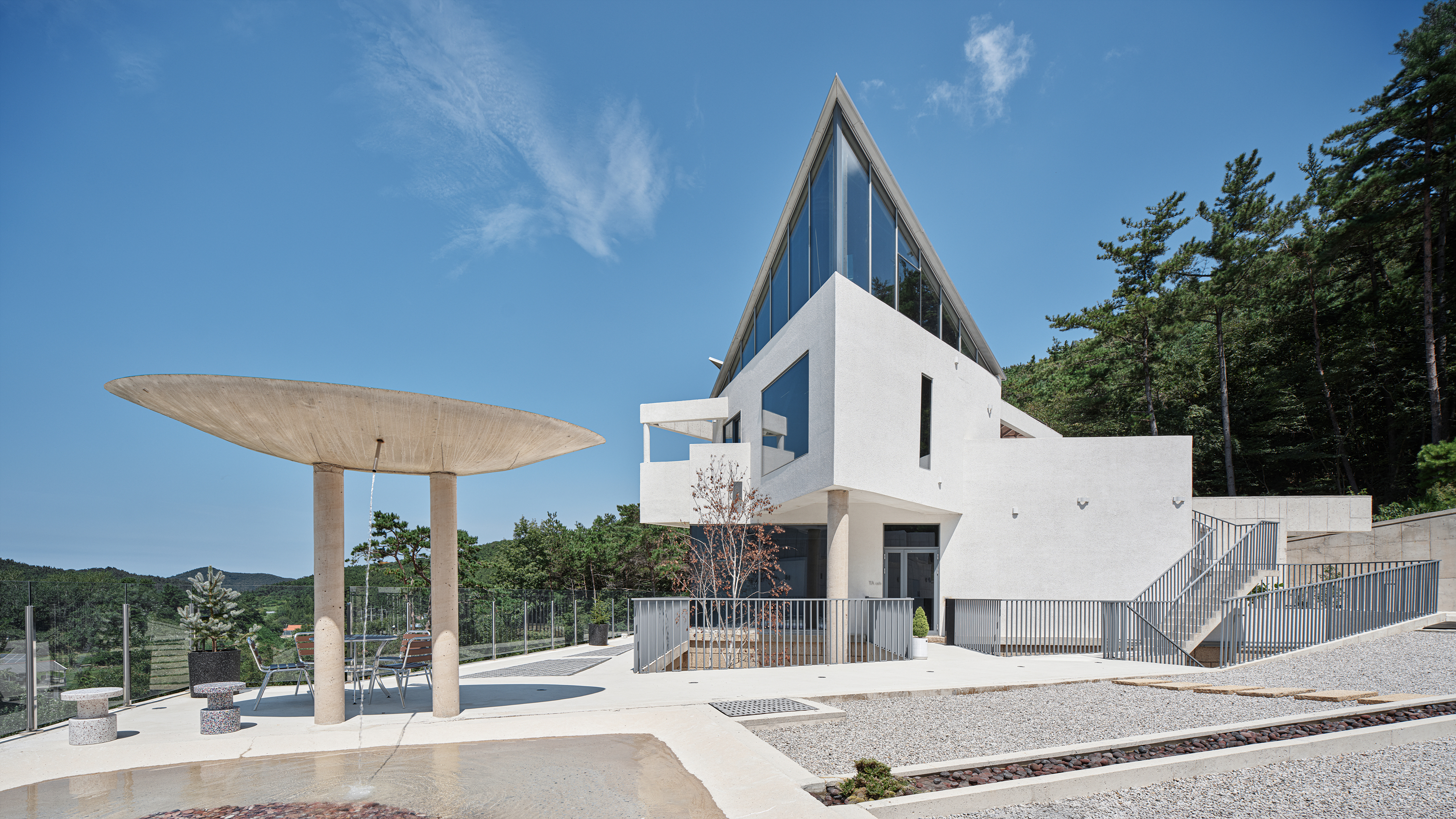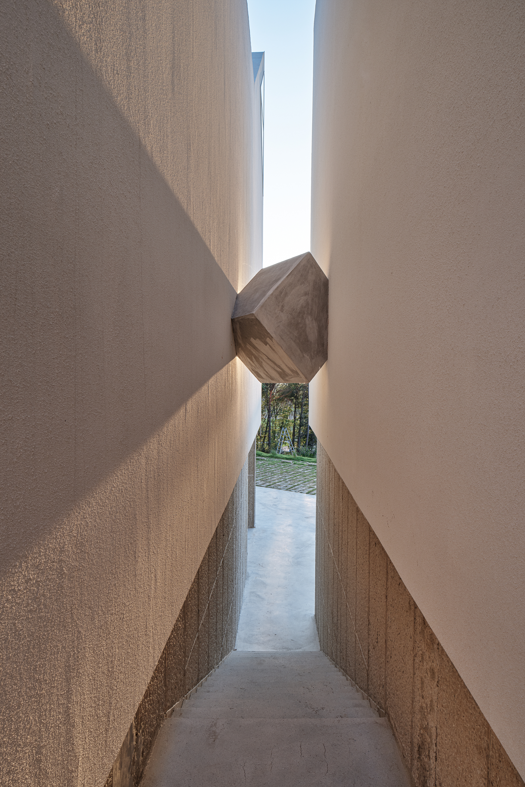 두 동의 하부는 노출 콘크리트로 마감되어 땅의 무게를 드러내고, 상부의 백색 스터코는 하늘의 가벼움을 반사한다. 무겁고 가벼움, 거침과 매끄러움이 대비되는 이 물성은 비움이 만들어낸 긴장을 더욱 선명하게 드러낸다. 기울어진 삼각형의 두 동은 땅에 단단히 닿아 있으면서도, 큰 비움에 의해 가볍게 들어 올려진 듯한 인상을 남긴다. 비워낸 공간은 형태를 지탱하는 보이지 않는 힘이 되어, 건축을 물리적 구조를 넘어 시지각적 균형의 상태로 끌어올린다.