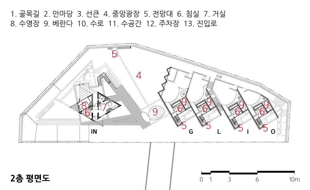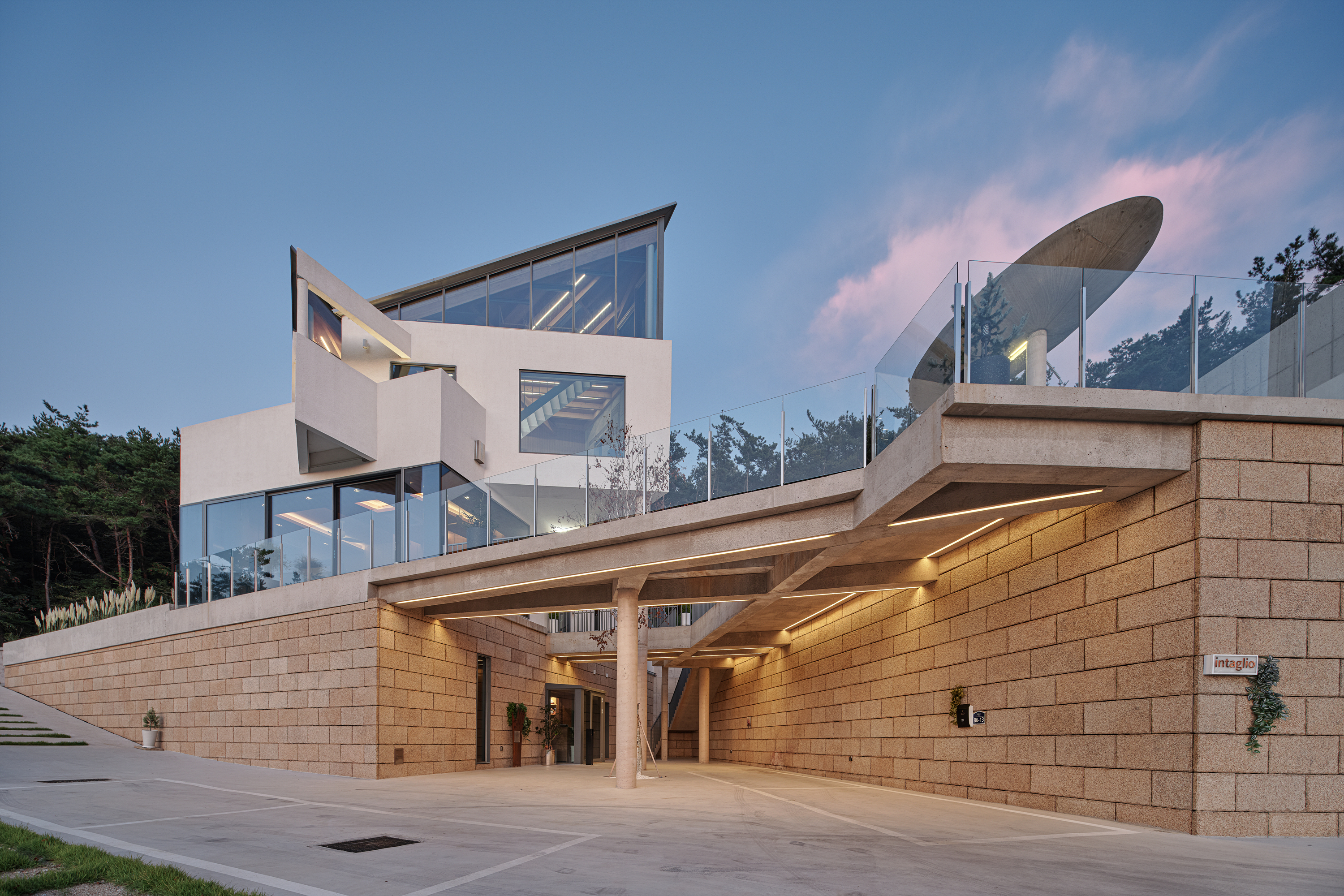 울창한 숲을 따라 이어지는 높은 콘크리트 옹벽은 각 스페이스를 구획하는 동일한 높이의 옹벽들과 함께 하나의 골목을 만든다. 이 골목을 따라 걷다 마주하는 프라이빗 정원, 그리고 그 너머로 이어지는 G·L·i·O 스페이스 유닛들은 방문객을 각 객실로 천천히 이끈다. 외부에서 내부로, 다시 자신 안쪽으로 깊어지는 이 레이어의 과정 속에서 방문자는 공간을 통과하며 저마다의 ‘인탈리오’를 새기게 된다. 그렇게 인탈리오는 건축의 이름이자, 이곳에 머무는 경험 자체를 설명하는 하나의 방식이 된다.