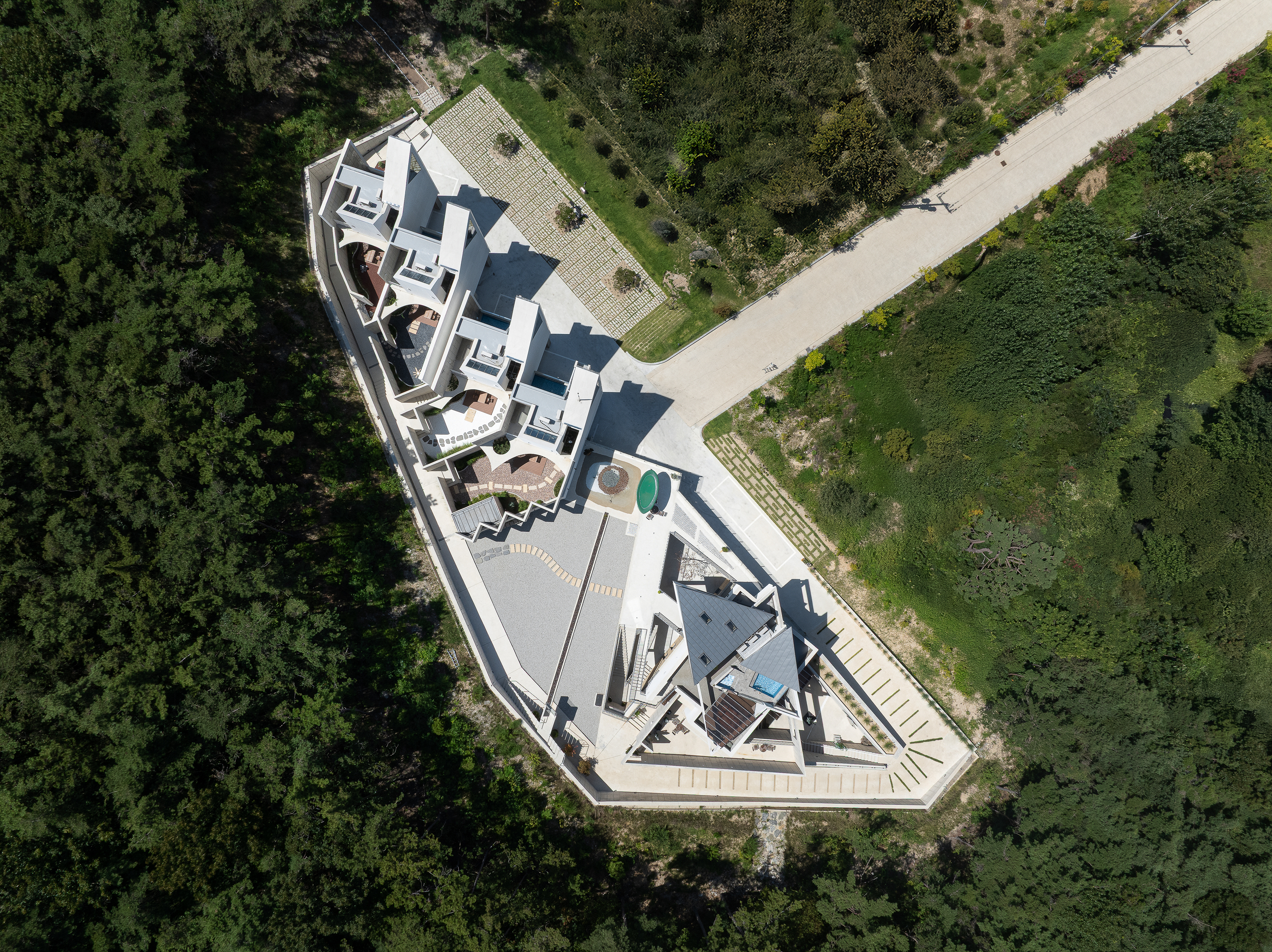 The lower parts of the two buildings are finished in exposed concrete, showing the weight of the ground. Above, white stucco reflects the lightness of the sky. This contrast—heavy and light, rough and smooth—sharpens the tension created by emptiness. The two tilted triangular volumes feel firmly grounded, yet appear gently lifted by the large void between them. The emptied space becomes an invisible force that holds the form, raising the architecture from physical structure to a state of visual balance.