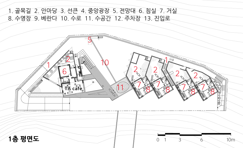인탈리오(intaglio)는 여러 개의 독립된 매스가 리듬감 있게 놓여 하나의 풍경을 만든다. 각각의 유닛은 독채 펜션(스테이)으로 계획되었고, In동 한켠에는 건축주가 머무는 카페(TA cafe)와 지하 음악실(T ground)이 고요히 깃들었다.