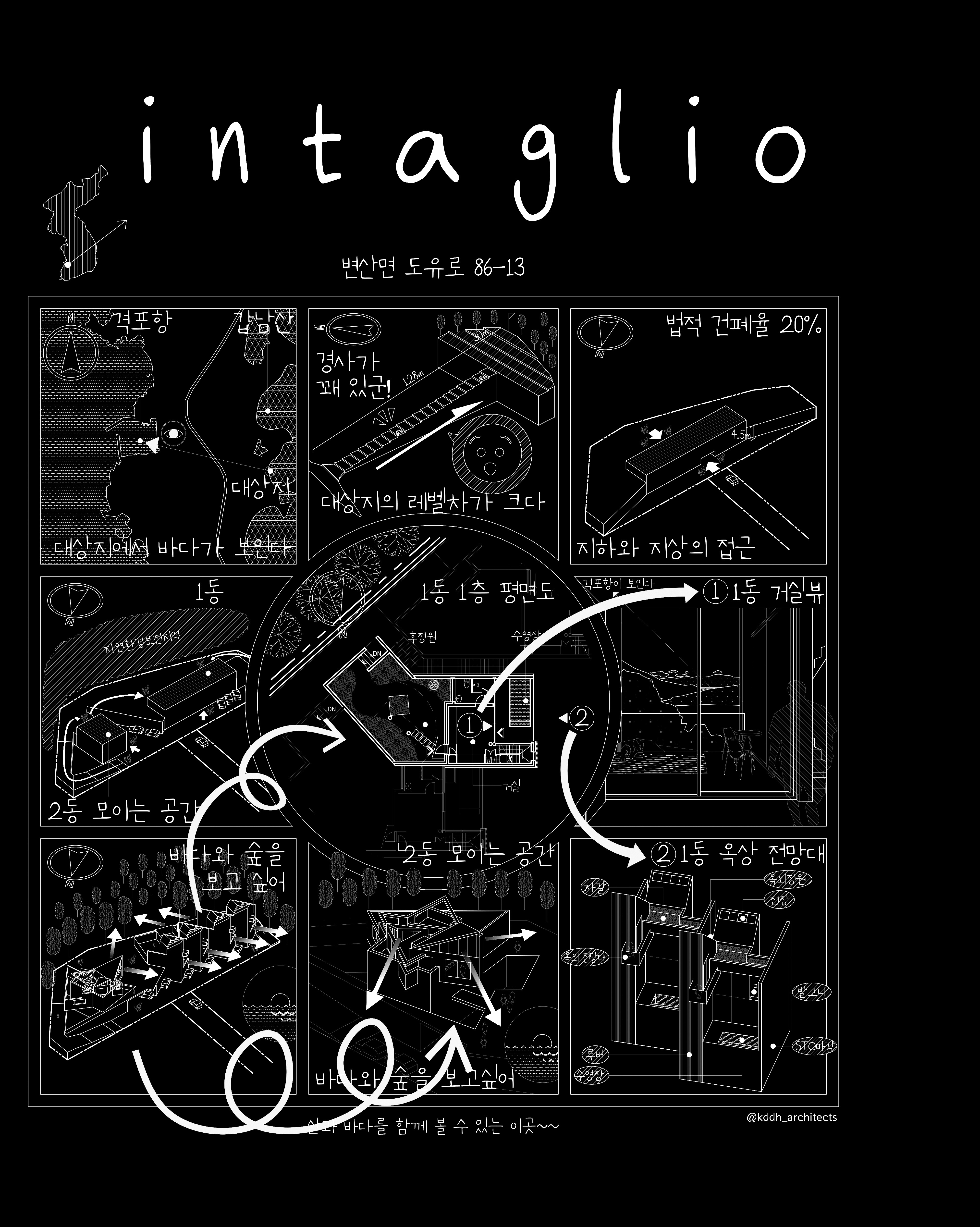 intaglio Architect | Kim Donghee_KDDH architects Client | Park Changseo Supervisor | Lee Chunsung _ Daon Architects Construction | Hammersound Project team | Son Jeongyong / Yu Giju Design intention realization | KDDH architects Location | Docheong-ri, Byeonsan-myeon, Buan-gun, Jeollabuk-do Program | Commercial, Multi-family house Site area | 2,095.00㎡ Building area | 374.30㎡ Gross floor area | 505.24㎡ Building to land ratio | 17.87% Floor area ratio | 15.69% Building scope | B1F - 2F Structure | RC, Wood structure Exterior finishing | STO, Exposed Concrete, Granite Tile, Colored Steel Sheet Interior finishing | Concrete Grinding, High quality wall paper Design period | Dec. 2022 – Jul. 2023 Construction period | Aug. 2023 - Feb. 2025 Photograph | Lee Hanul Structural engineer | Jin structural engineering Mechanical·Electrical·Fire engineer | Geonchang engineering |