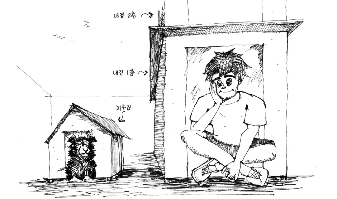 다시 바닥판에 결구하고 뒷판과 앞판을 옆판 각재에 결구하였다. 지붕판 못질을 다시 시작했다. 성공이다. 맞배지붕 위에 주워다 놓은 폐장판을 덮어주고 안 쓰던 모포 한 장을 집 안에 깔아줬다. 개집이 완성됐다. 제법 그럴싸했다. 비 오는 날, 머루가 개집에 들어가 비 피하는 모습을 보면 뿌듯했다. 건축물의 기본 기능이리라.