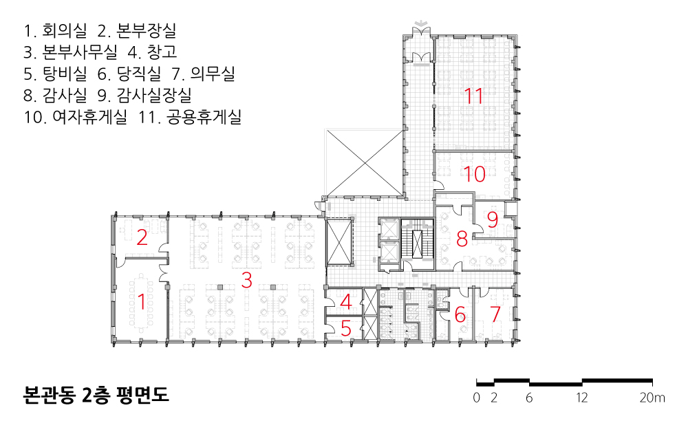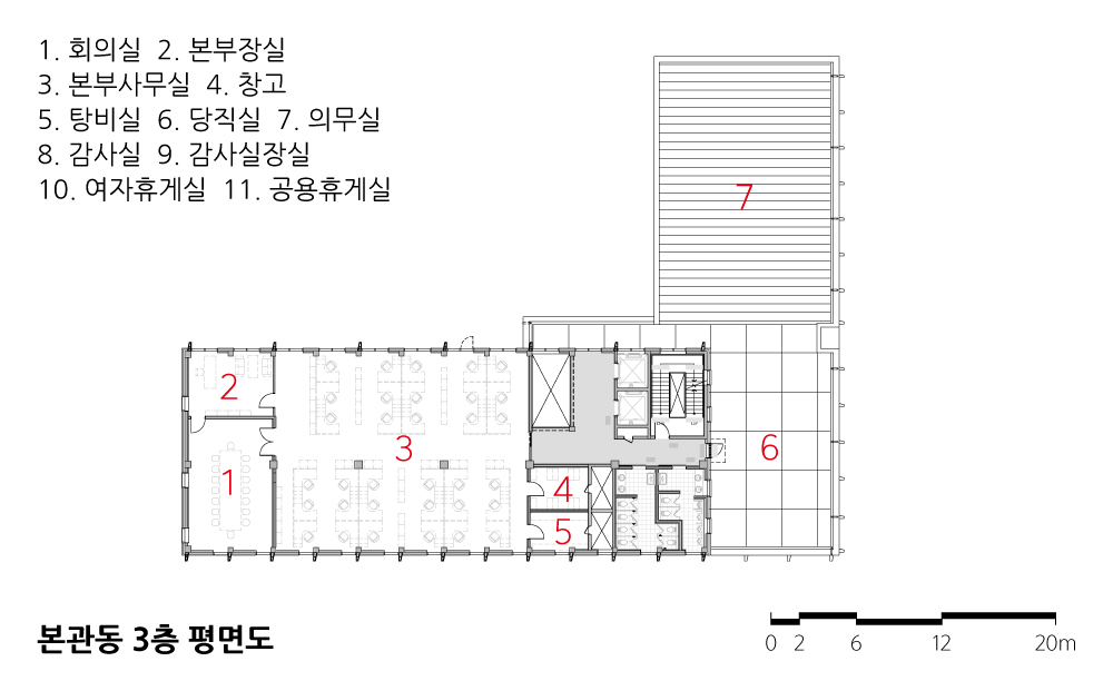 도시건축을 이루는 첫 번째 유형은 업무시설이다. 업무공간을 위한 합리적인 모듈과 가변성을 갖는 구조시스템으로 구성된다. 수직과 수평의 반복적 모듈을 적용하고 RC코어와 CLT벽체로 횡력을 보강했다. 목재는 구조재이면서 마감재로 사용되는데 근대 오피스의 이성적인 공간구성을 성취하면서 친근한 분위기를 형성한다.