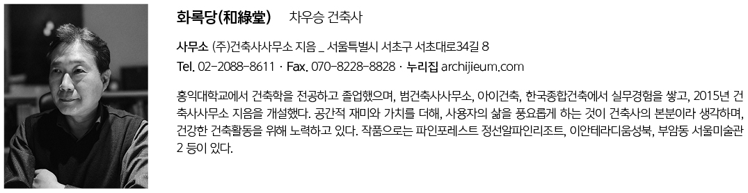 | 화록당(和綠堂) 설계자 | 차우승 건축사_ (주)건축사사무소 지음 건축주 | 임승준, 양현숙 감리자 | 차우승 _ (주)건축사사무소 지음 시공사 | 엠오에이종합건설 설계팀 | 김영태, 안예은 인테리어팀 | 이준희, 석지혜 설계의도 구현 | (주)건축사사무소 지음 대지위치 | 인천광역시 연수구 송도동 주요용도 | 단독주택 대지면적 | 460.10㎡ 건축면적 | 137.10㎡ 연면적 | 475.74㎡ 건폐율 | 29.80% 용적률 | 49.68% 규모 | B1F - 2F 구조 | 철근콘크리트구조 외부마감재 | 라임스톤(모카크림) 내부마감재 | 비닐페인트, PVC직물타일, 무늬목 설계기간 | 2022. 03 - 2023. 03 공사기간 | 2024. 04 - 2025. 07 사진 | 김준영 구조분야 | (주)제이씨드 엔지니어링 기계설비·전기·소방분야 | 선인기술단 주식회사 |