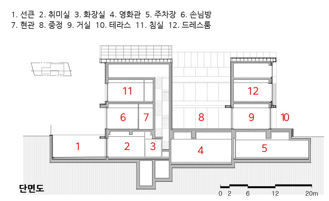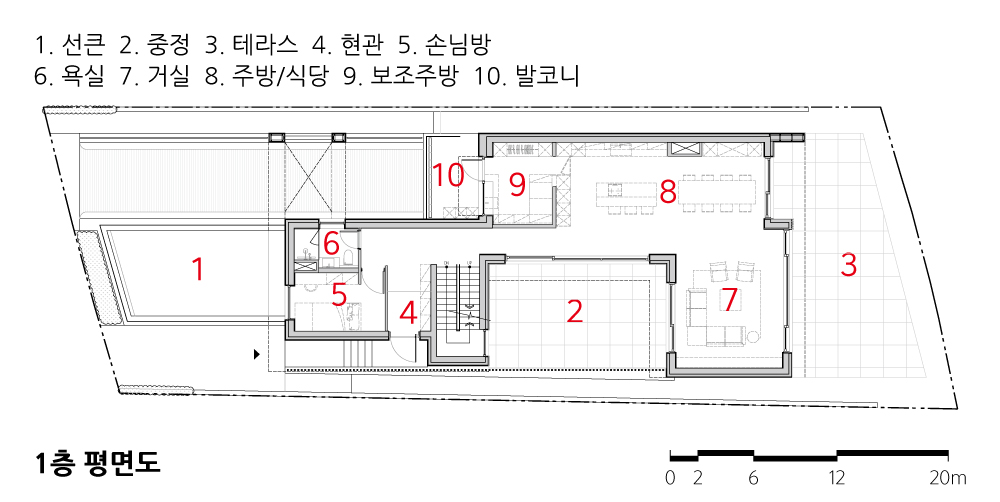 전면이 좁은 직사각형 형태의 대지에 썬큰가든, 중정, 테라스를 구성하여 자연과 소통하고자 했다. 도로 측 썬큰가든은 취미실을, 거실, 식당, 주방은 중정과 테라스로 연결되어 채광·환기를 확보하며, 확장된 공간감을 제공한다.