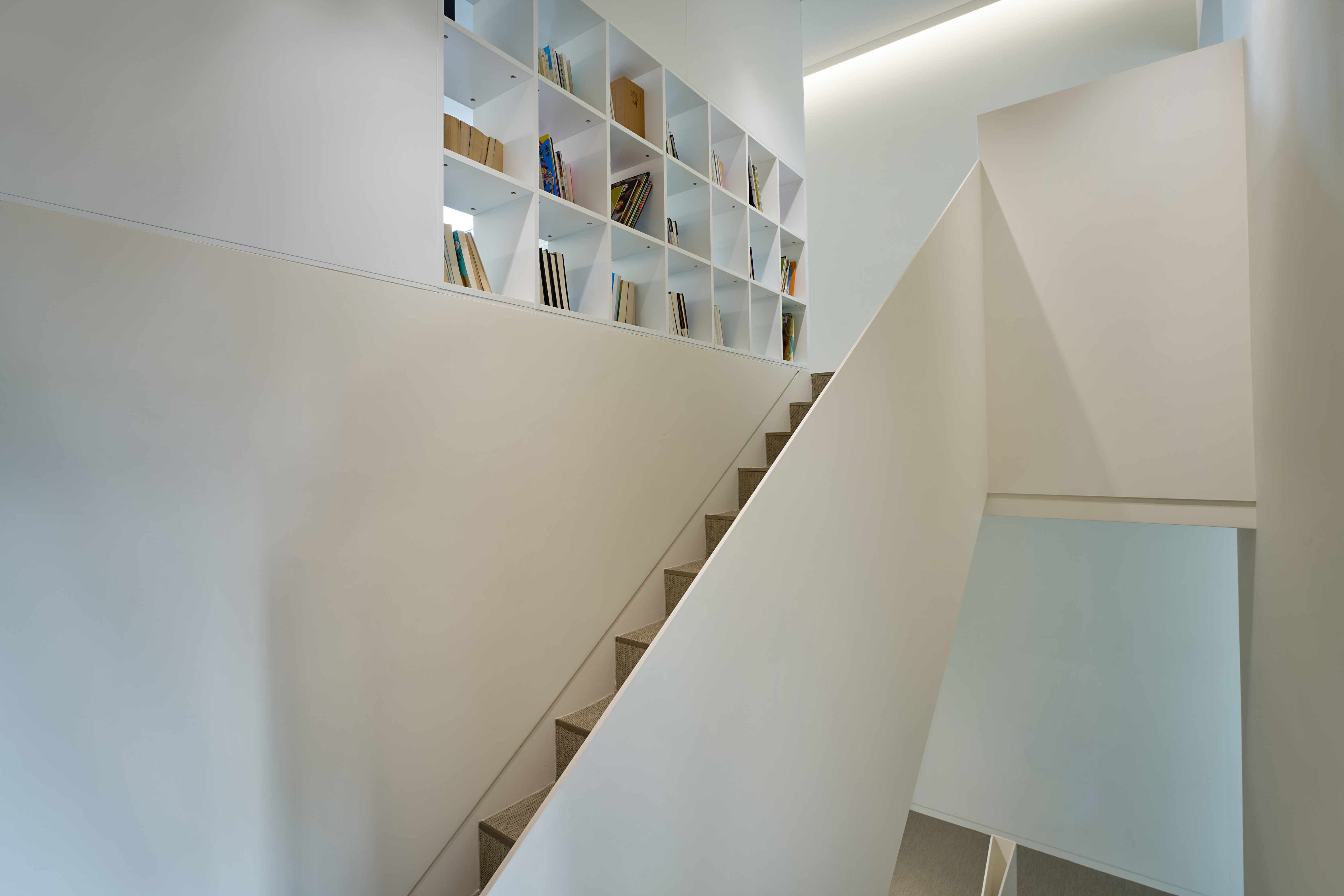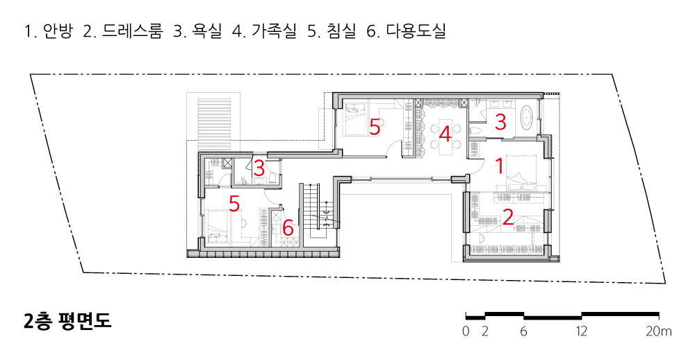 도로에서 출입구가 즉각적으로 드러나지 않는 구성으로, 마당-포치–현관–내부로 이어지는 시각·심리적 완충을 통해 외부와 내부의 경계를 완화하였다. 중정, 거실, 테라스의 중첩되는 배치로 시선은 단계적으로 깊이를 인식하고, 내부공간은 확정된다.