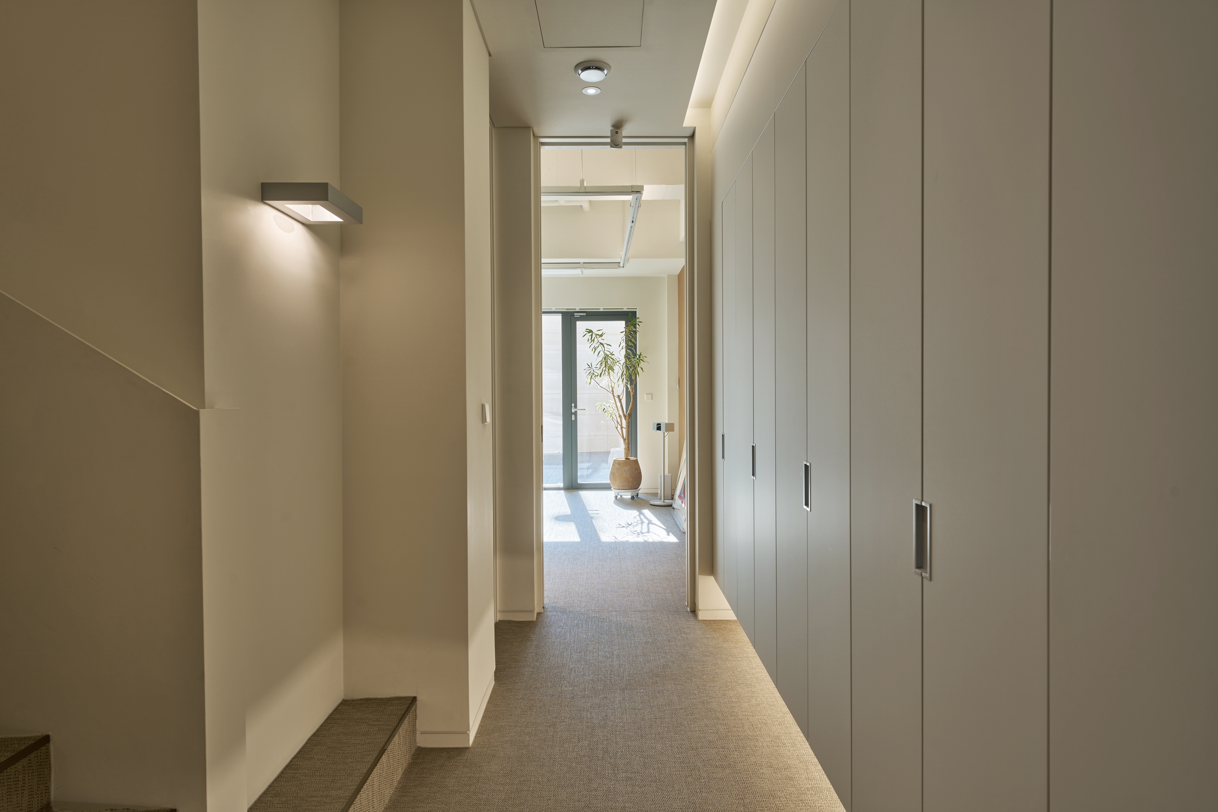 Rather than revealing the entrance directly from the street, the approach was designed as a sequence—from yard to porch, entrance, and interior—creating visual and psychological buffers. Through the layered arrangement of courtyard, living room, and terrace, views gain depth step by step, gradually defining the interior space.