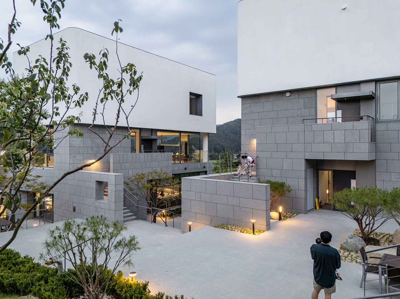 On the lower levels of each building, multipurpose living spaces were placed to allow easy connection with outdoor areas, encouraging active interaction between interior and exterior spaces. Guest rooms were arranged on the upper levels, with privacy carefully considered so that users could focus on rest and relaxation.