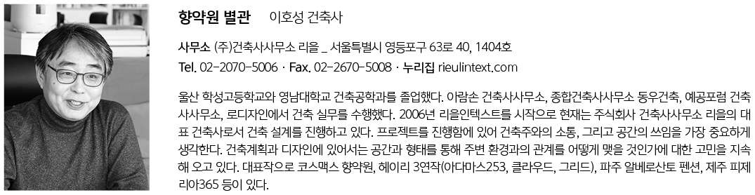 외관 디자인은 기존 ‘향약원’의 정체성을 계승하는 동시에, 주변 자연과의 조화를 이루도록 했다. 저층부는 대지의 물성을 닮은 재료를 사용하여, 자연 속으로 스며들도록 하였다. 상층부는 기존 ‘향약원’과 조화를 고려하여, 백색의 순수한 매스로 계획하였으며, 시각적 통일감을 부여했다.