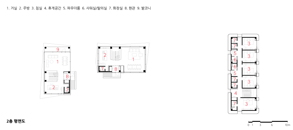 각 주동의 저층부에는 외부 공간과 연계가 용이한 다목적 거실을 배치하여, 내외부 공간의 소통이 원활하도록 하였다. 상층부에는 프라이버시를 고려한 객실을 두어, 이용자가 휴식에 집중할 수 있도록 하였다. 모든 주동은 지형의 등고를 따라 엇갈리게 배치하여, 상호 간의 조망 간섭을 최소화했다. 이는 모든 실에서 금계산의 자연을 온전히 마주하게 하려는 의도였다.