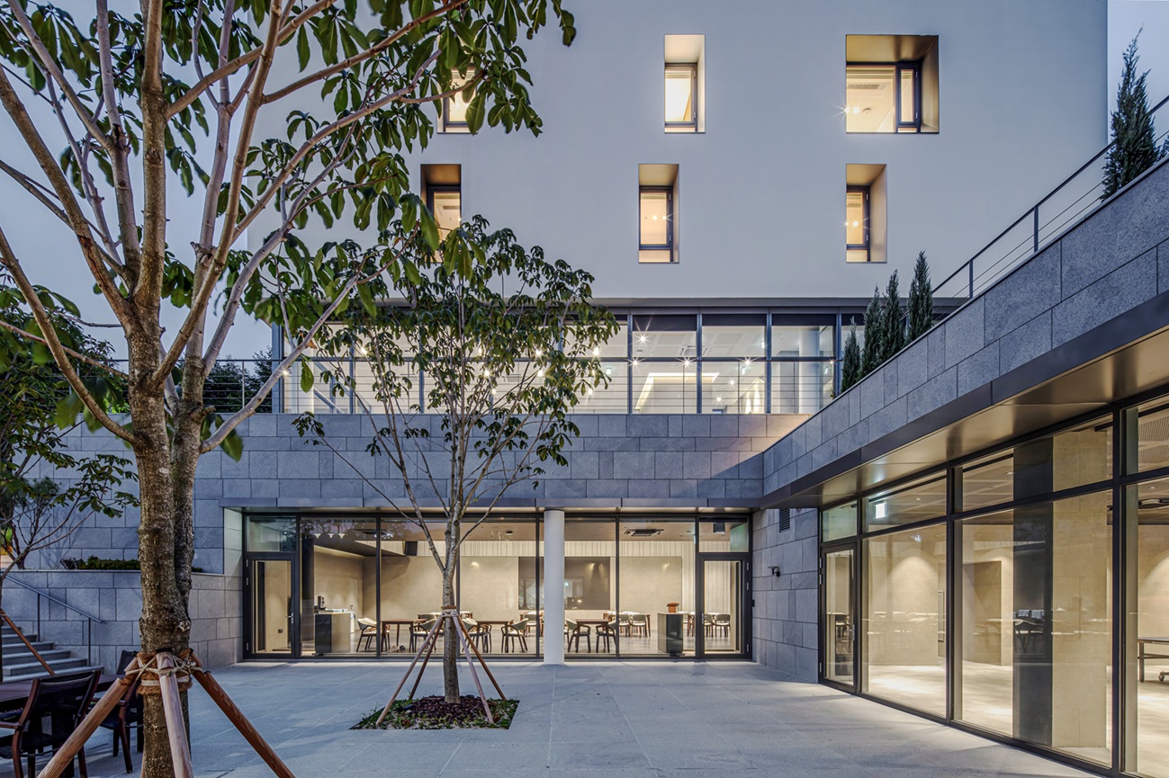 The exterior design inherits the identity of the existing Hyangyakwon while harmonizing with the surrounding natural environment. At the lower levels, materials that echo the texture of the site were used, allowing the buildings to visually merge with the landscape. The upper levels were planned as pure white masses, in dialogue with the original Hyangyakwon, creating a sense of visual unity across the complex.