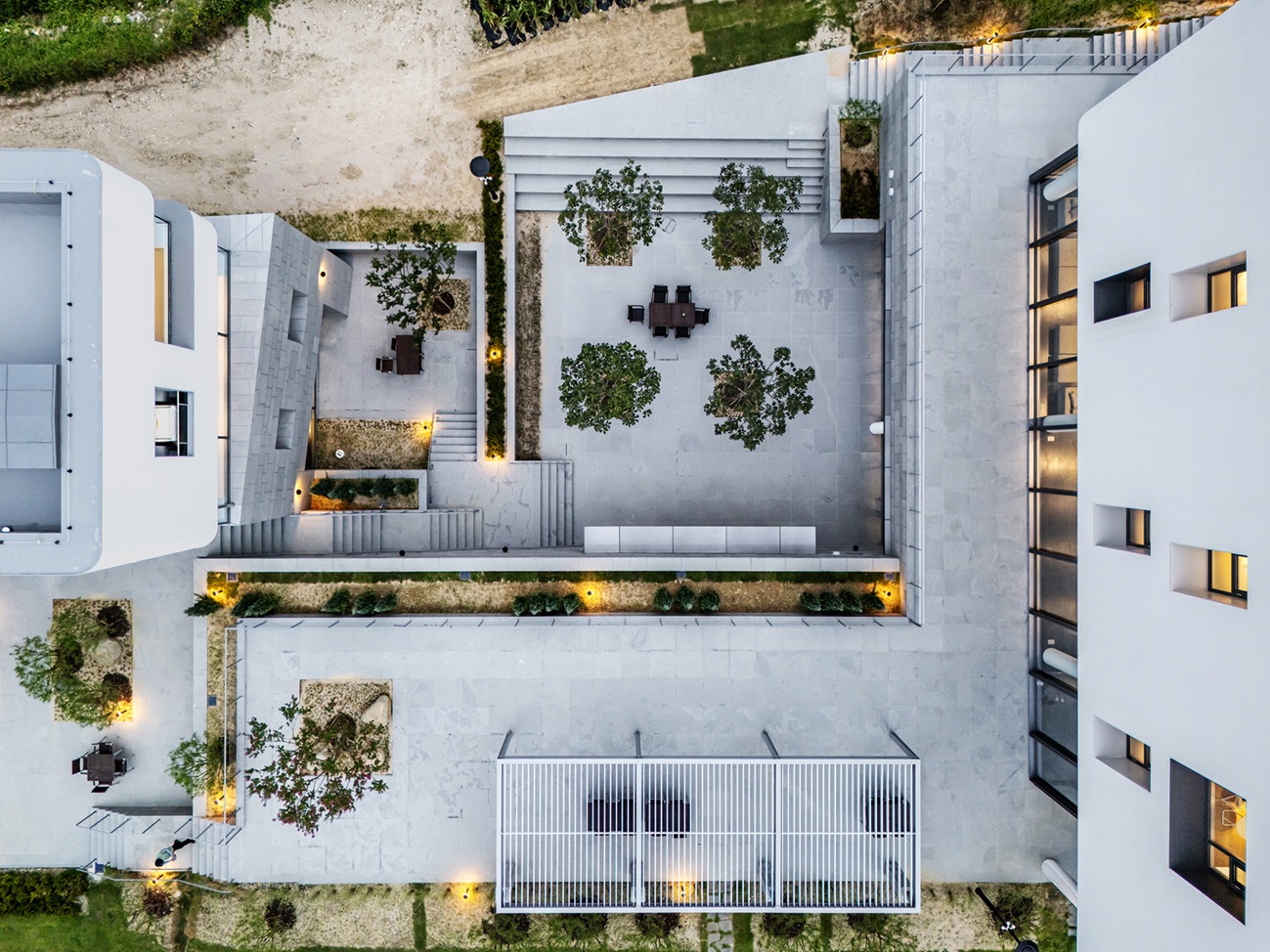 Within this simple formal language, the overlapping of white volumes and the constantly shifting shadows created by the changing terrain prevent monotony and give the architecture a rich and nuanced expression.