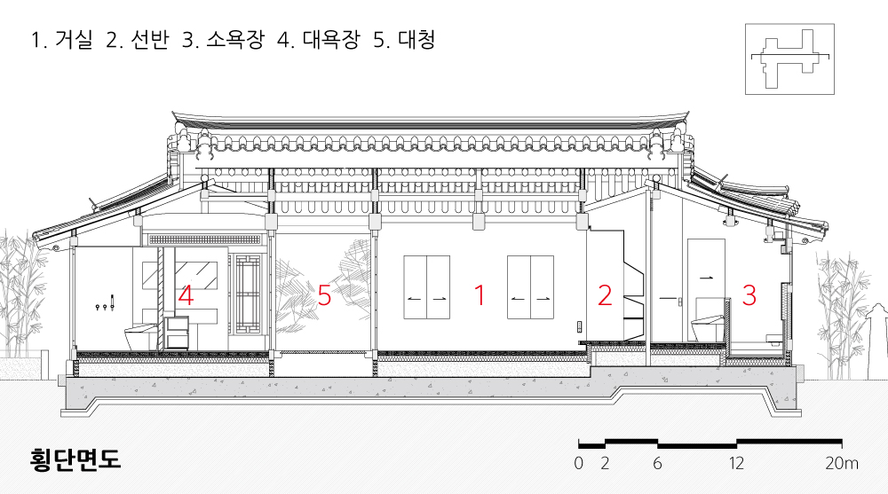 대지는 남측의 아파트와 정비되지 않은 인접 대지, 북동 측의 물안개·사당·본채 기와지붕과 자연 풍경이 대비되는 양면성을 지닌다. “아파트 뷰가 드러나지 않았으면 좋겠다”는 건축주의 요구에 따라 한옥의 전통적인 ‘ㄷ’ 자 배치를 변형, 한자의 ‘책(冊)’자를 닮은 양방향 대칭 구성으로 작은 대지 안에 남서·북동 두 마당을 마련했다. 마당의 크기와 방향을 조절해 좋은 풍경은 최대한 끌어들이고 피하고 싶은 시선은 자연스럽게 가리도록 하였다.