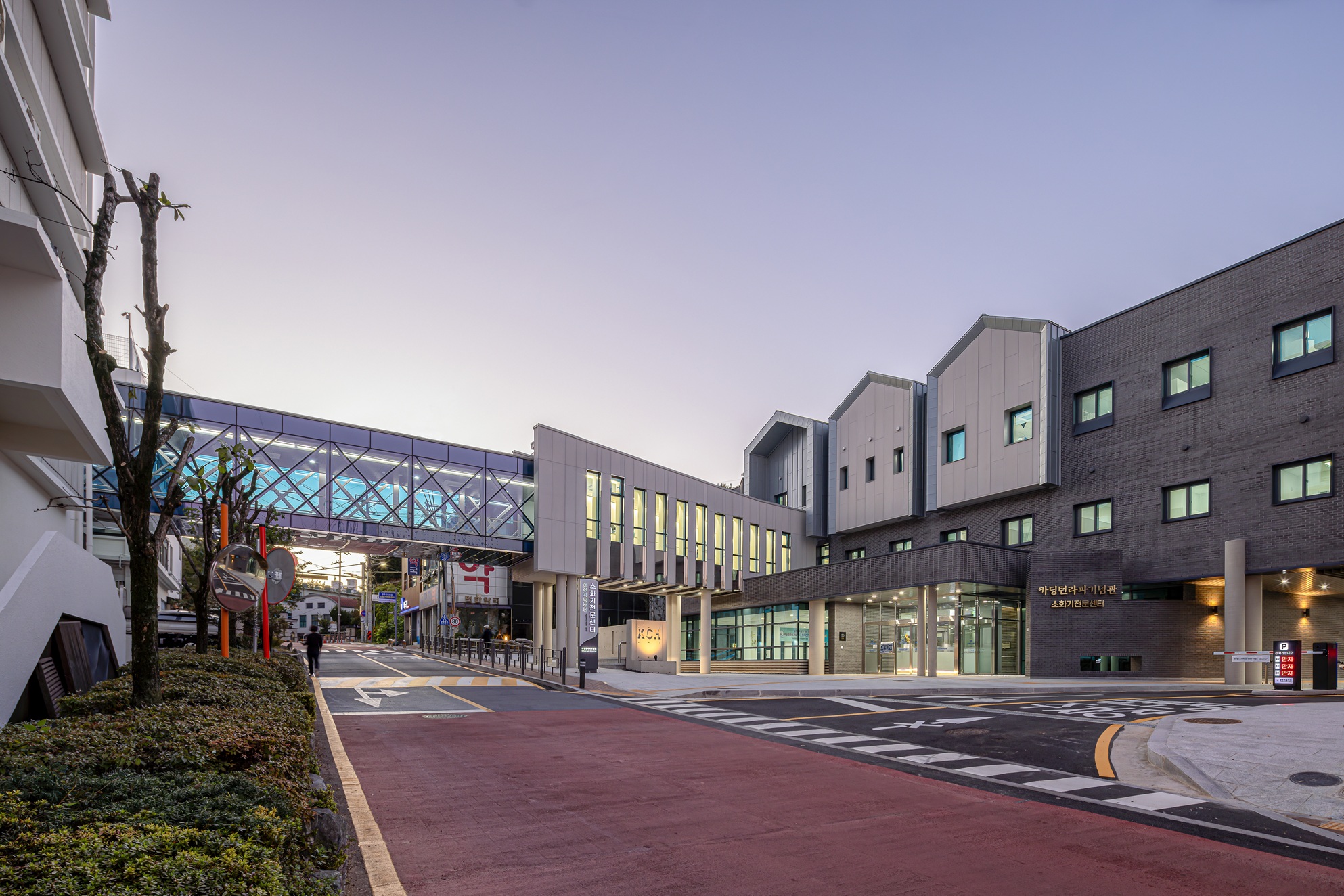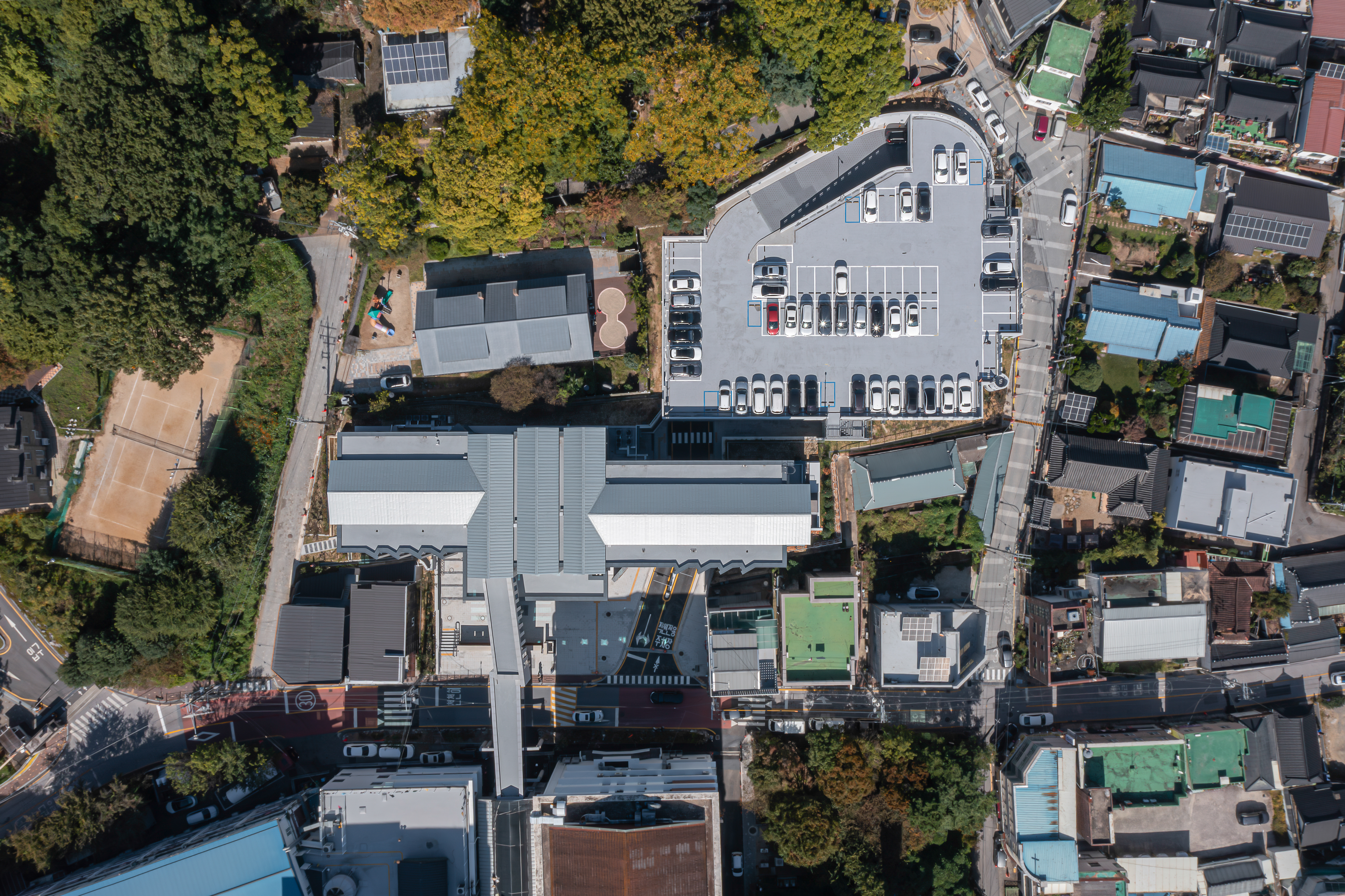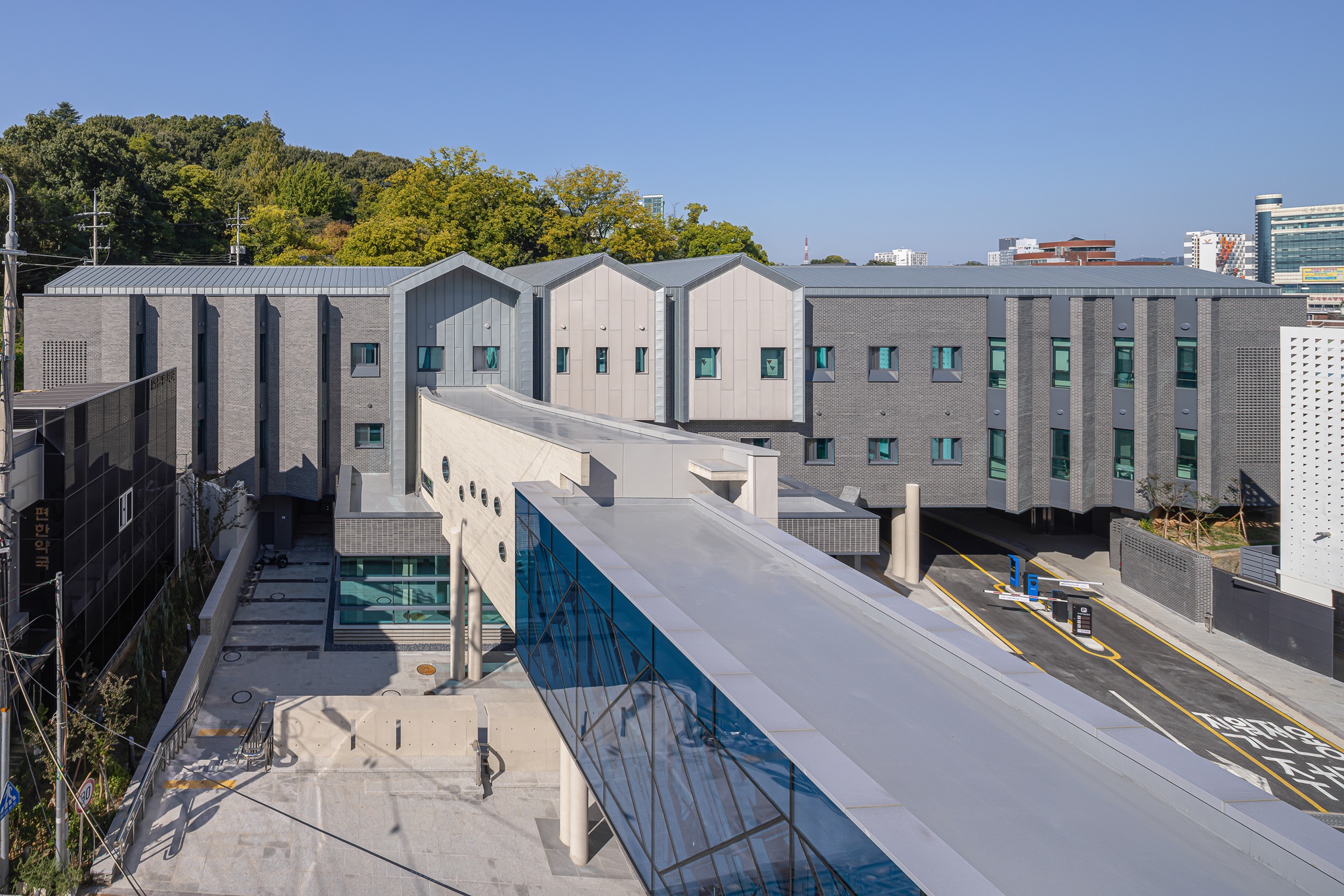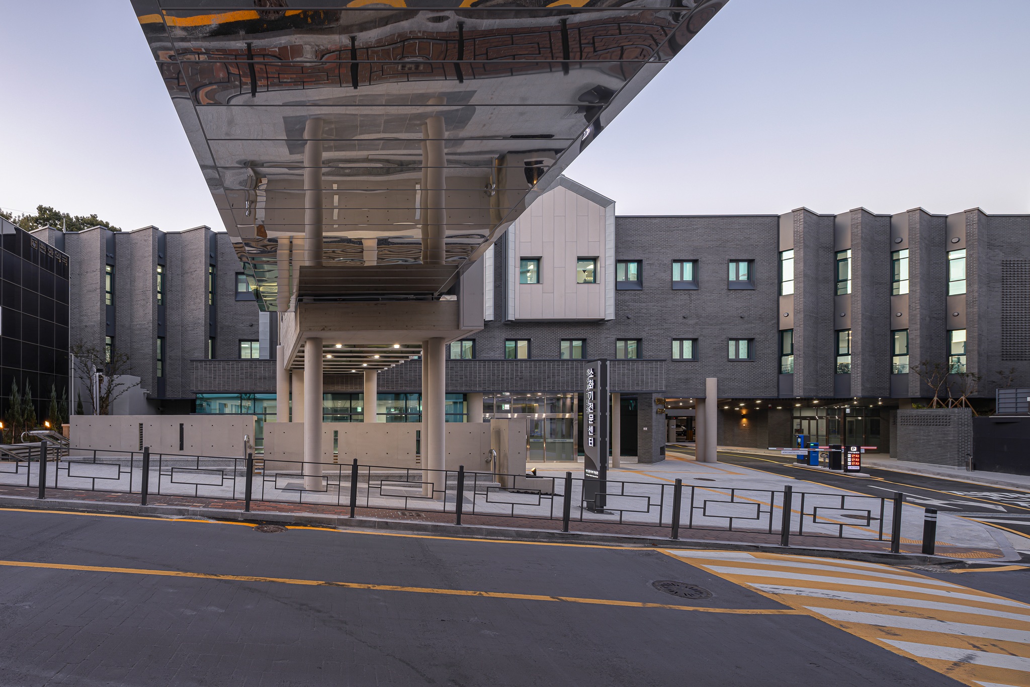 This project develops a new outpatient care building—including a memorial hall—and an attached parking facility on the former outdoor parking lot across an 8m-wide road on the north side of the hospital’s main building. The site is an irregularly shaped, sloping parcel situated between the existing hospital and the missionary residences along the foothills of Yangnim Mountain, and it is subject to height and roof-form limitations due to nearby heritage assets. Although the legal allowance was a two-story building, we actively used the terrain and applied a weightedaverage height calculation. This allowed the basement level to be exposed along the street frontage, securing an elevation where three levels are perceived from the front.