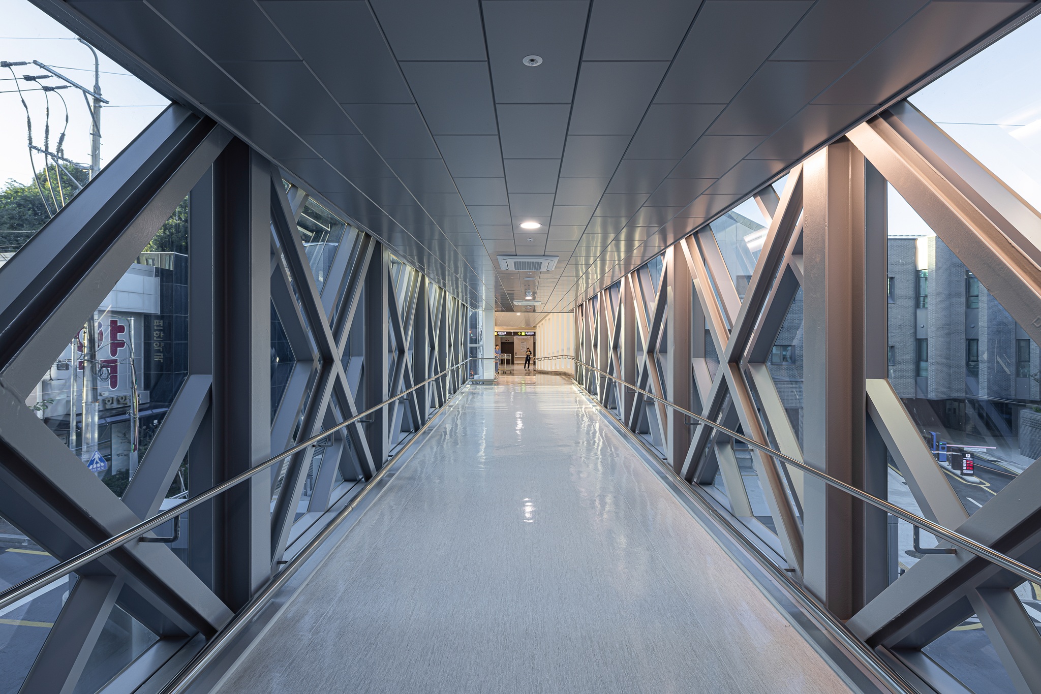 1층 외래 진료공간은 본관동과 단절된 조건을 극복하기 위해 약 36m 길이의 연결통로로 이어진다. 이 통로는 단순한 이동이 아닌 ‘길’로서의 공간 경험을 목표로 ▲바닥 폭과 층고의 변화 ▲보이드와 솔리드의 대비 ▲구조 시스템의 전환 ▲매스의 꺾임과 어긋남을 통해 연속적이면서도 다층적인 체험을 유도한다. 외관은 전벽돌을 주재료로 하여 주변 근대건축의 재료적 맥락을 잇고, 벽돌을 내부까지 연속 적용해 내·외부의 경계를 흐린다. 이 건축은 기능과 기억, 장소성이 균형을 이루는 일상의 장소가 되기를 지향한다.