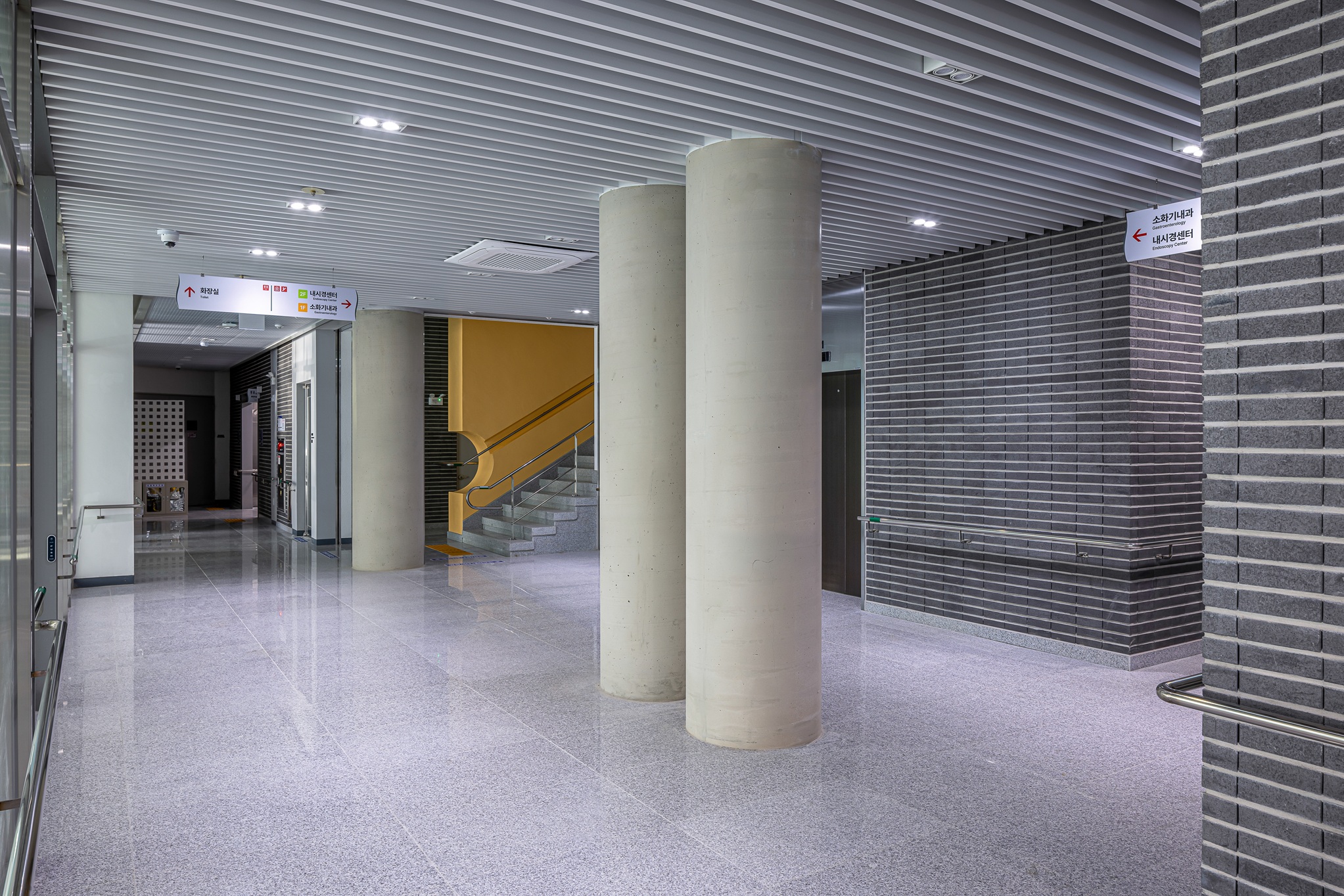 지하층에는 카딩턴 선교사의 기념관과 근린생활시설, 필로티로 구성된 부설주차장 진입부를 배치했다. 전면 보행로가 협소한 조건을 고려해 건물을 후퇴 배치하고, 마당을 조성해 휴게와 체류가 가능한 외부 공간을 마련했다. 이는 병원 이용자뿐 아니라 시민에게 열려 있는 공간을 지향한 결과다.
