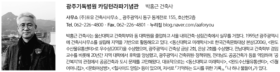 | 광주기독병원 카딩턴라파기념관 설계자 | 박홍근 건축사_ (주)포유 건축사사무소 건축주 | (재)광주기독병원 감리자 | 박홍근 _ (주)포유 건축사사무소 시공사 | 남광건설(주) 설계팀 | 이광덕, 류연아, 이동근, 양정주 설계의도 구현 | (주)포유 건축사사무소 대지위치 | 광주광역시 남구 양림동 주요용도 | 의료시설(종합병원) 대지면적 | 2,525.00㎡ 건축면적 | 1,238.02㎡ 연면적 | 2,983.99㎡ 건폐율 | 49.03% 용적률 | 77.06% 규모 | B1F - 2F 구조 | 철근콘크리트구조 외부마감재 | 점토벽돌(삼한C1), 라인징크, 압출성형시멘트패널, 로이복층유리 내부마감재 | 화강석, IQ 옵티마, 점토별돌(삼한C1), 페인트 설계기간 | 2022. 02 – 2023. 03 공사기간 | 2023. 08 – 2025. 09 사진 | 김성희 구조분야 | (주)미르엔지니어링 기계설비·전기·소방분야 | (유)장강 |