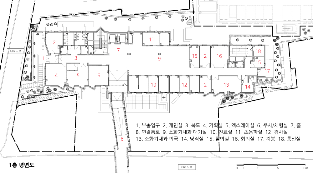 1층 외래 진료공간은 본관동과 단절된 조건을 극복하기 위해 약 36m 길이의 연결통로로 이어진다. 이 통로는 단순한 이동이 아닌 ‘길’로서의 공간 경험을 목표로 ▲바닥 폭과 층고의 변화 ▲보이드와 솔리드의 대비 ▲구조 시스템의 전환 ▲매스의 꺾임과 어긋남을 통해 연속적이면서도 다층적인 체험을 유도한다. 외관은 전벽돌을 주재료로 하여 주변 근대건축의 재료적 맥락을 잇고, 벽돌을 내부까지 연속 적용해 내·외부의 경계를 흐린다. 이 건축은 기능과 기억, 장소성이 균형을 이루는 일상의 장소가 되기를 지향한다.