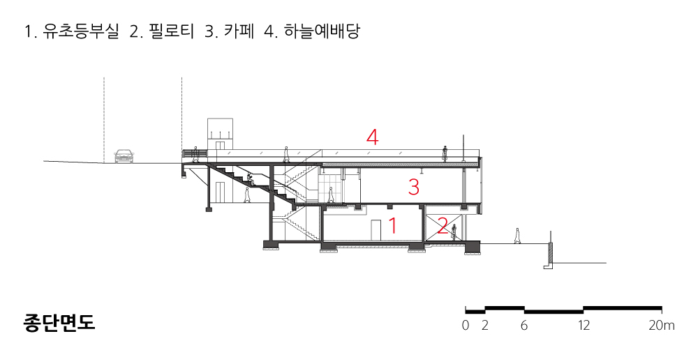윗 도로에서 외부계단을 따라 내려가면 2층 주출입구를 만난다. 출입구 전면에는 비 안 맞는 외부공간을 계획하여 마치 작은 무대처럼 소모임, 연주활동 등 취미공간으로 활용할 수 있게 계획했고 계단은 야외 관람석으로 이용이 가능하다. 중심의 출입구에 면한 2층에는 라운드 형태의 카페를 계획하여 전면의 전망을 즐기며 사람들의 소통과 쉼, 교류공간으로 계획하였다. 또 남측엔 대예배당을, 북측엔 도서관 같은 교회기념관을 계획하여 두 가지 용도를 적절히 분리하였다. 1층은 소모임, 사무 공간 등으로 구성하였고 양측 매스는 안아주는 듯한 느낌이 들도록 중심을 향해 17도 가량 회전시켰다.