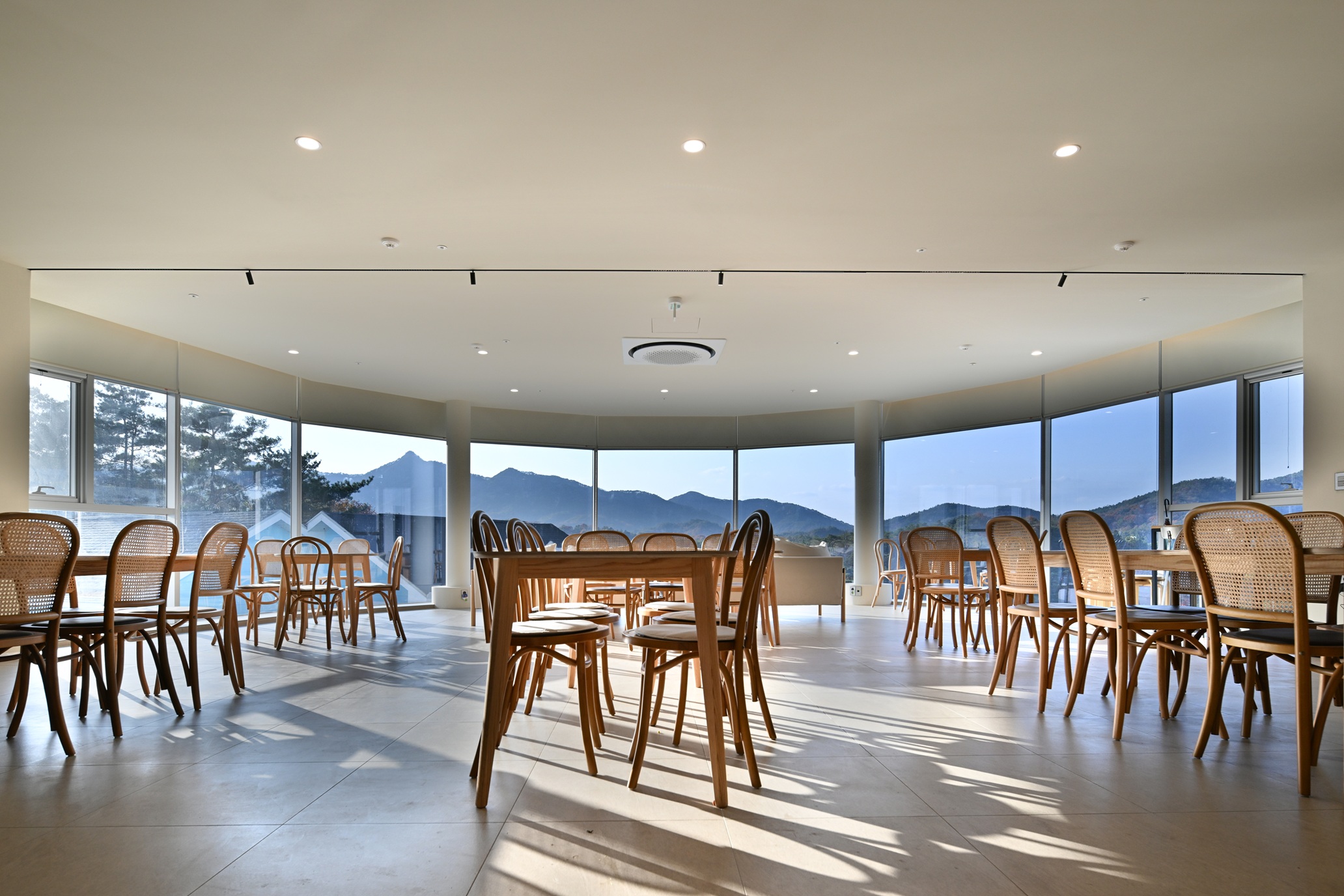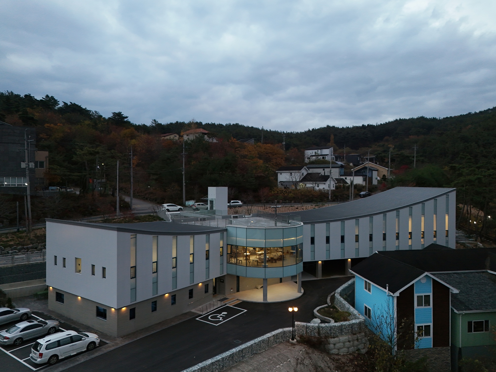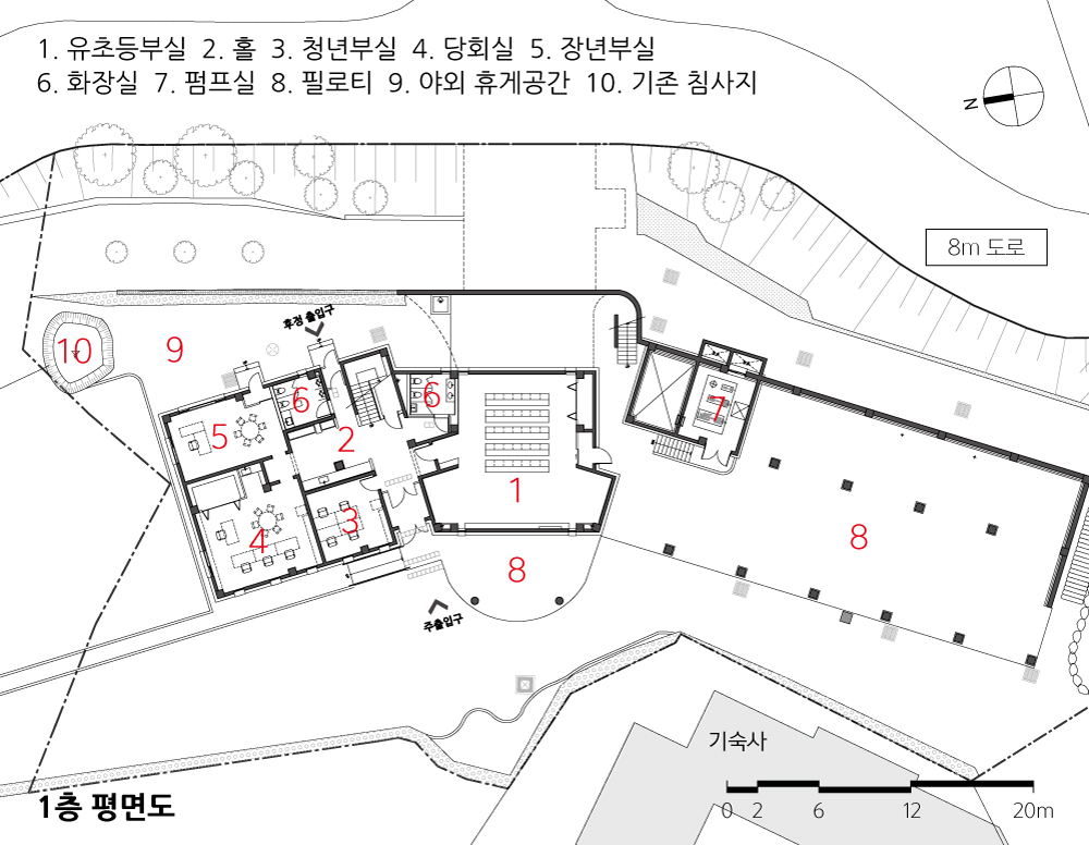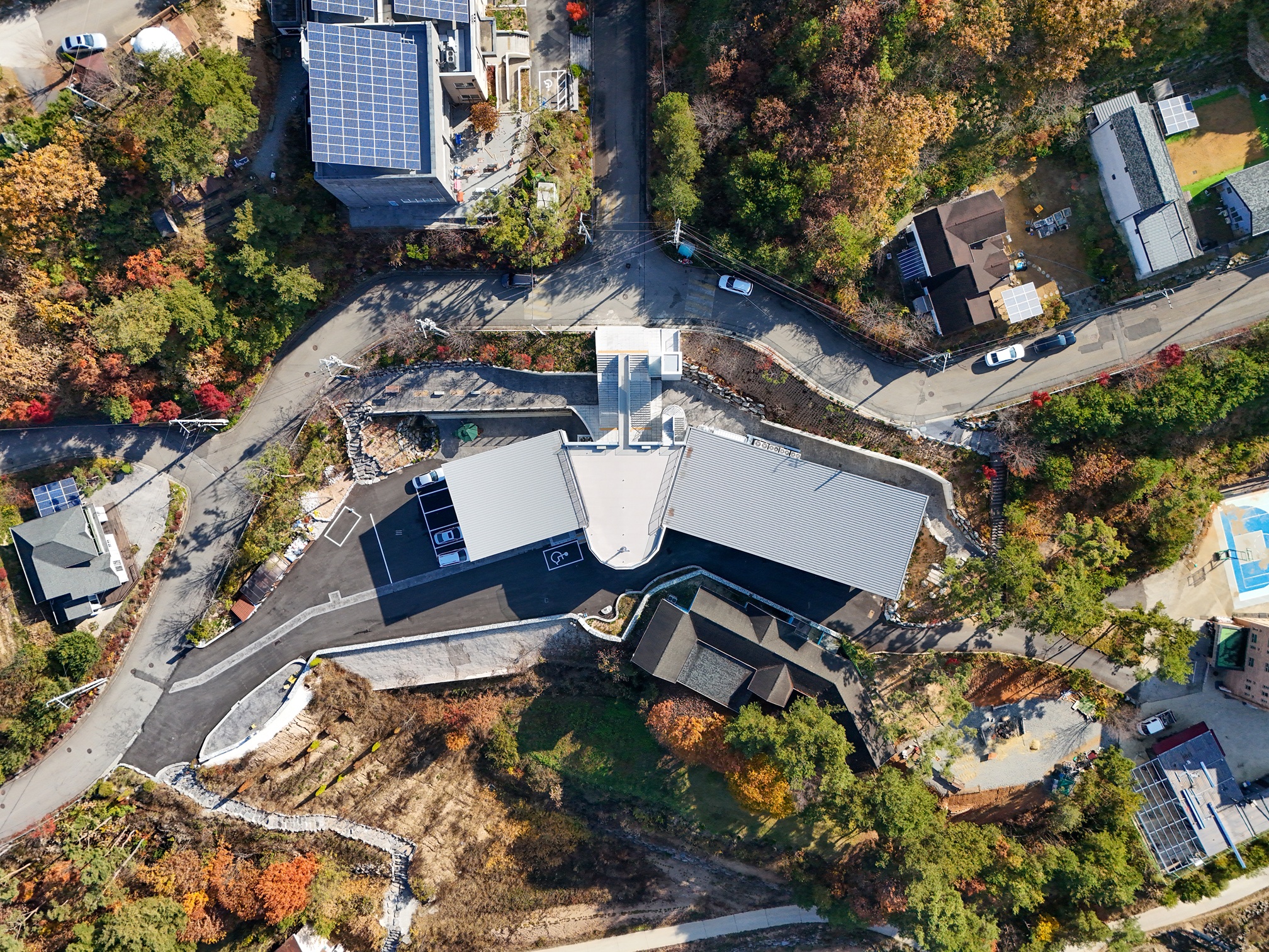 The site sits at the heart of a village carved into a hillside, with a dramatic level difference of 8.5 meters between the upper road and the lower flat ground. From the busy upper road, the view is pure nature—only the mountain and the sky. Before I realize it, my steps feel as if they are walking into the sky, toward God. Architecture led by nature. For this church, the most defining scene will not be the sanctuary inside, but the rooftop—directly accessed from the road—where the presence of Byulmurri Church is most clearly felt.