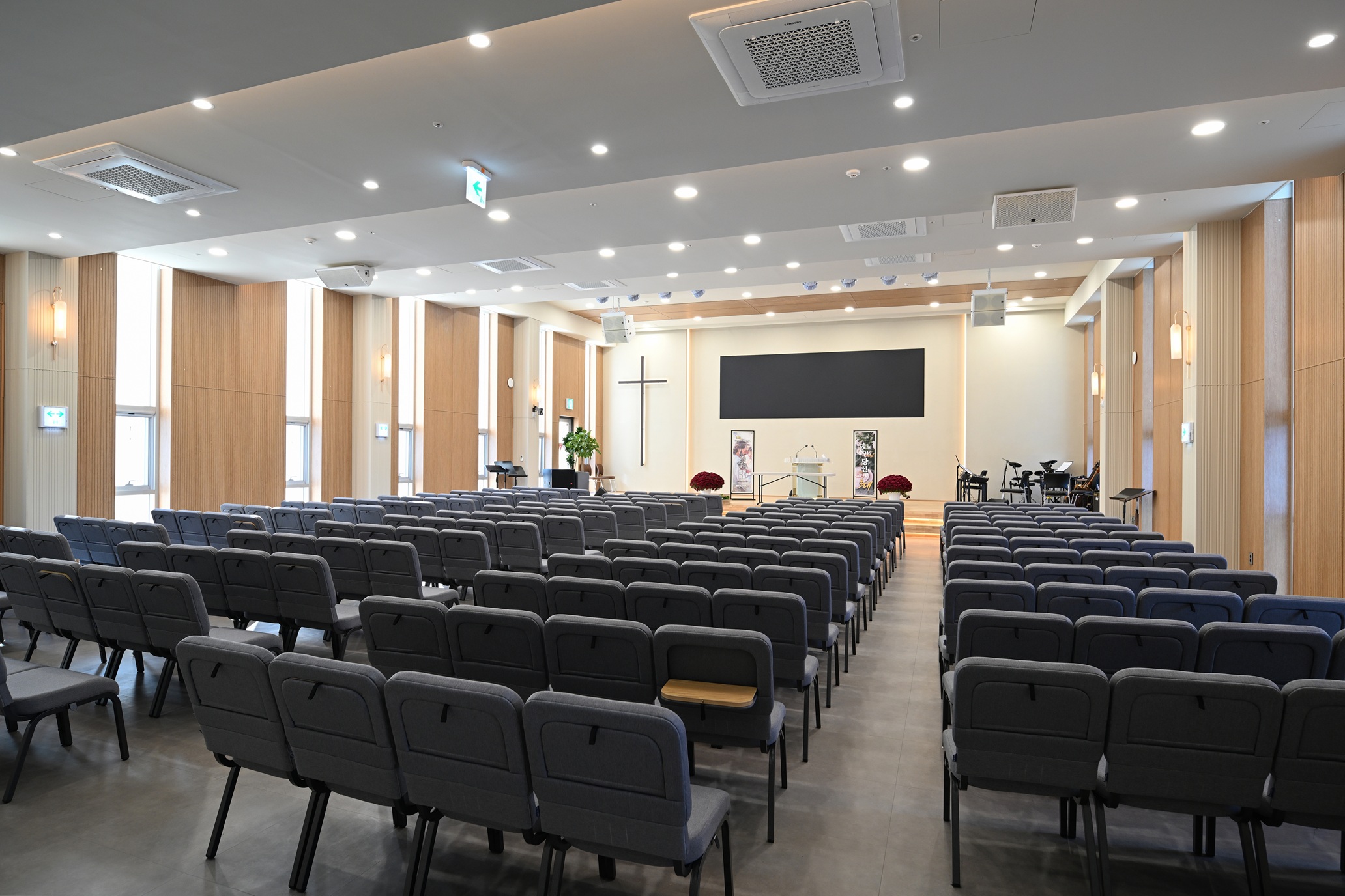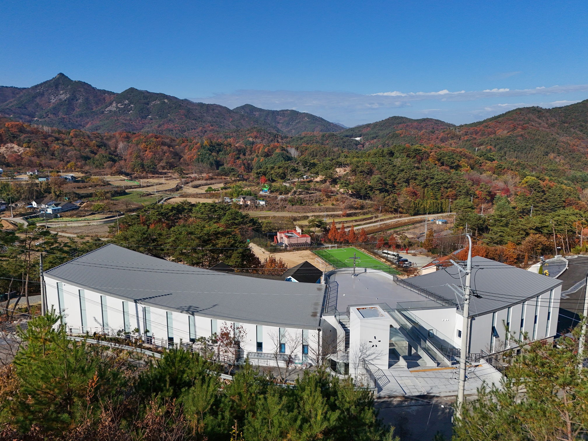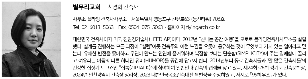 Byeolmuri church Architect | Seo Kyounghwa_Flying Architecture Client | Geumsan Byeolmuri church Supervisor | Seo Kyounghwa _ Flying Architecture Construction | CHEON KANG CONSTRUCTION Co..Ltd Design intention realization | Flying Architecture Location | Sindong-ri, Namil-myeon, Geumsan-gun, Chungcheongnam-do Program | Religious facilities Site area | 2,558.00㎡ Building area | 786.53㎡ Gross floor area | 1,138.92㎡ Building to land ratio | 30.75% Floor area ratio | 44.52% Building scope | 2F Structure | RC, Steel Structure Exterior finishing | Sandwich panel, T11.5 ceramic Interior finishing | Paint, Tile Design period | Sep. 2022 – May 2023 Construction period | May 2023 – Aug. 2024 Photograph | Yoo Geun Jong _ YOO STUDIO Structural engineer | Zywoo EnI Mechanical engineer | Codam Technical Group Electrical engineer | SUNG JI CO.. LTD Fire engineer | World Technical Group |