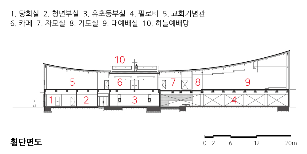 마치 세상을 굽어 살피며 두 팔로 안아주는 듯한 매스는 포용의 교회를 건축물로 형상화했다. 안아주는, 하늘을 향해 두 팔을 벌린, 환영하는 듯한 느낌의 수식어로도 설명할 수 있겠다. 기존의 다른 수직성을 강조한 많은 교회와는 다르게 수평성이 인상적인 건물이다. 이 수평성은 대지가 지닌 2개 층에 가까운 8.5미터 레벨차가 이루어낸 결과이다. 윗 도로는 보행자의 이동이 많아 주된 접근로가 되었다. 도로에서는 오로지 자연을 배경으로 야외 십자가만 오브제처럼 인지되도록 했고 시선을 차단하는 건물은 배제하였다. 도로에서 브리지를 지나 시선의 끝에 존재한 십자가 하나만으로 경건함을 느끼기에 부족함이 없다. 필자는 이곳을 하늘예배당이라 부르기로 했다. 매스의 중심부는 주출입구, 카페 등 공용공간으로, 양쪽 날개와도 같은 매스는 대예배당과 교회기념관으로 구성했다. 경사지를 활용하여 다양한 레벨에서도 출입구로 접근할 수 있도록 동선을 자연스럽게 연결했고 외부에도 버려지는 공간이 없도록 장애인과 노약자를 배려한 접근로, 휴게 공간, 취미 공간 등 최대한 효율적인 사용을 고려했다. 마치 날아오르는 듯 자유롭고 활기찬 이미지도 부여했는데 교회뿐만 아니라 학생들이 많이 사용하는 만큼 세상을 향해 비상하는 희망의 날개 짓이 되기를 바랐기 때문이다. 별무리 마을의 구심적 역할로서 상징성과 효용성을 담아내려 했다.