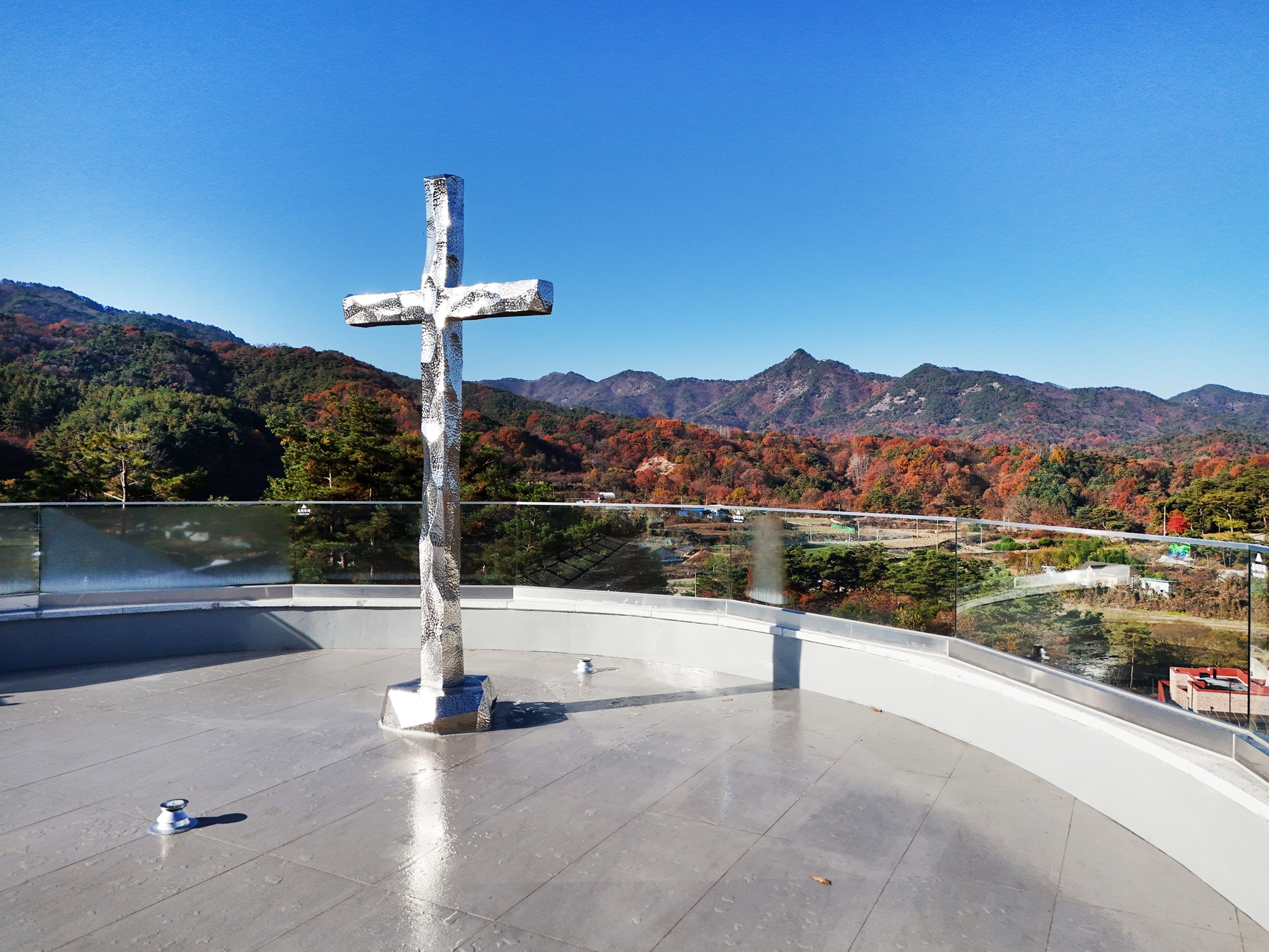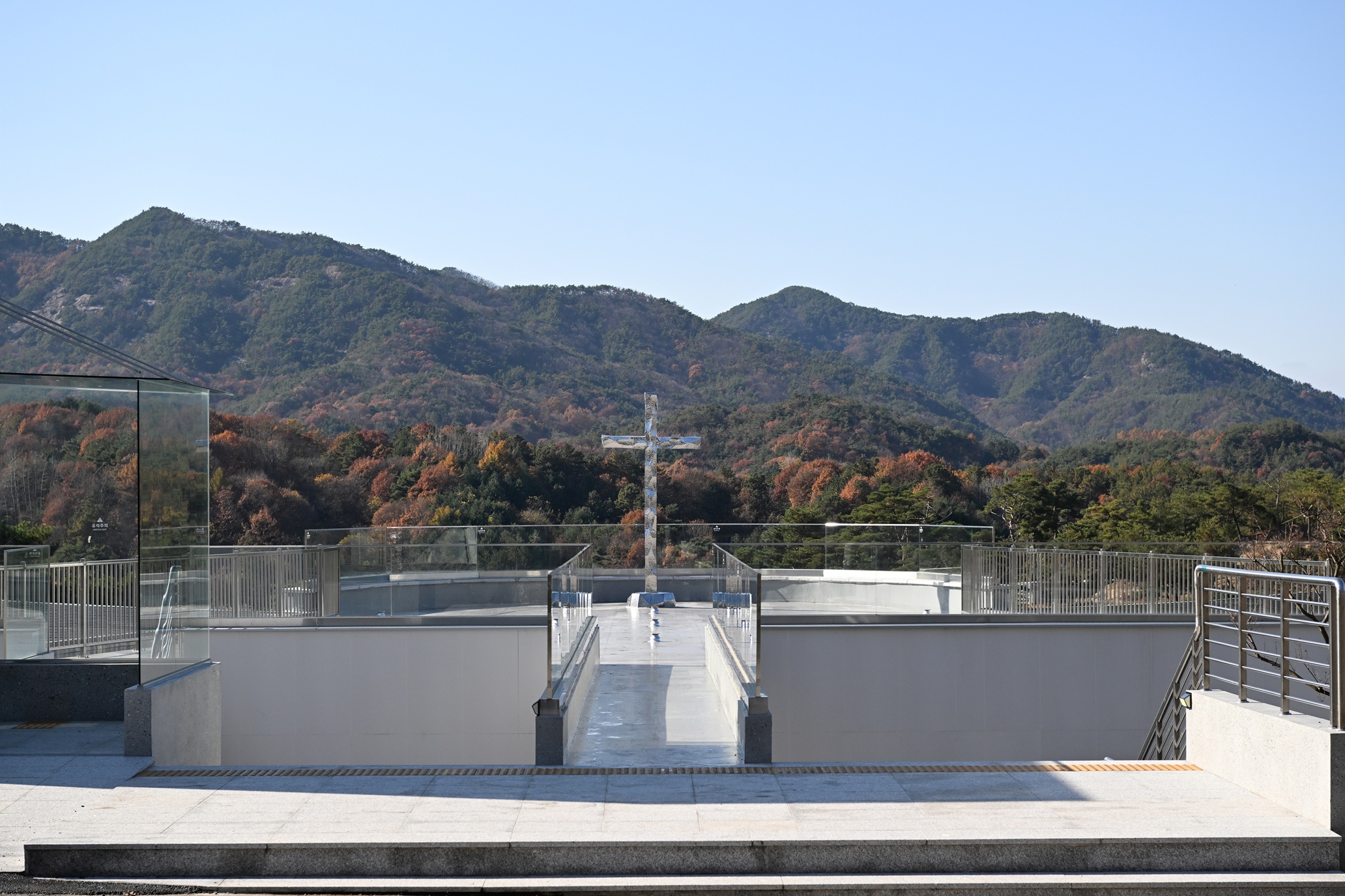 Because pedestrian flow is highest along the upper road, it becomes the main approach. From that road, we kept the background purely natural and allowed only an outdoor cross to be read as an object—removing any building volume that might block the view. Crossing the bridge, the single cross at the end of the sightline is enough to evoke reverence. I chose to call this place the “Sky Sanctuary.”