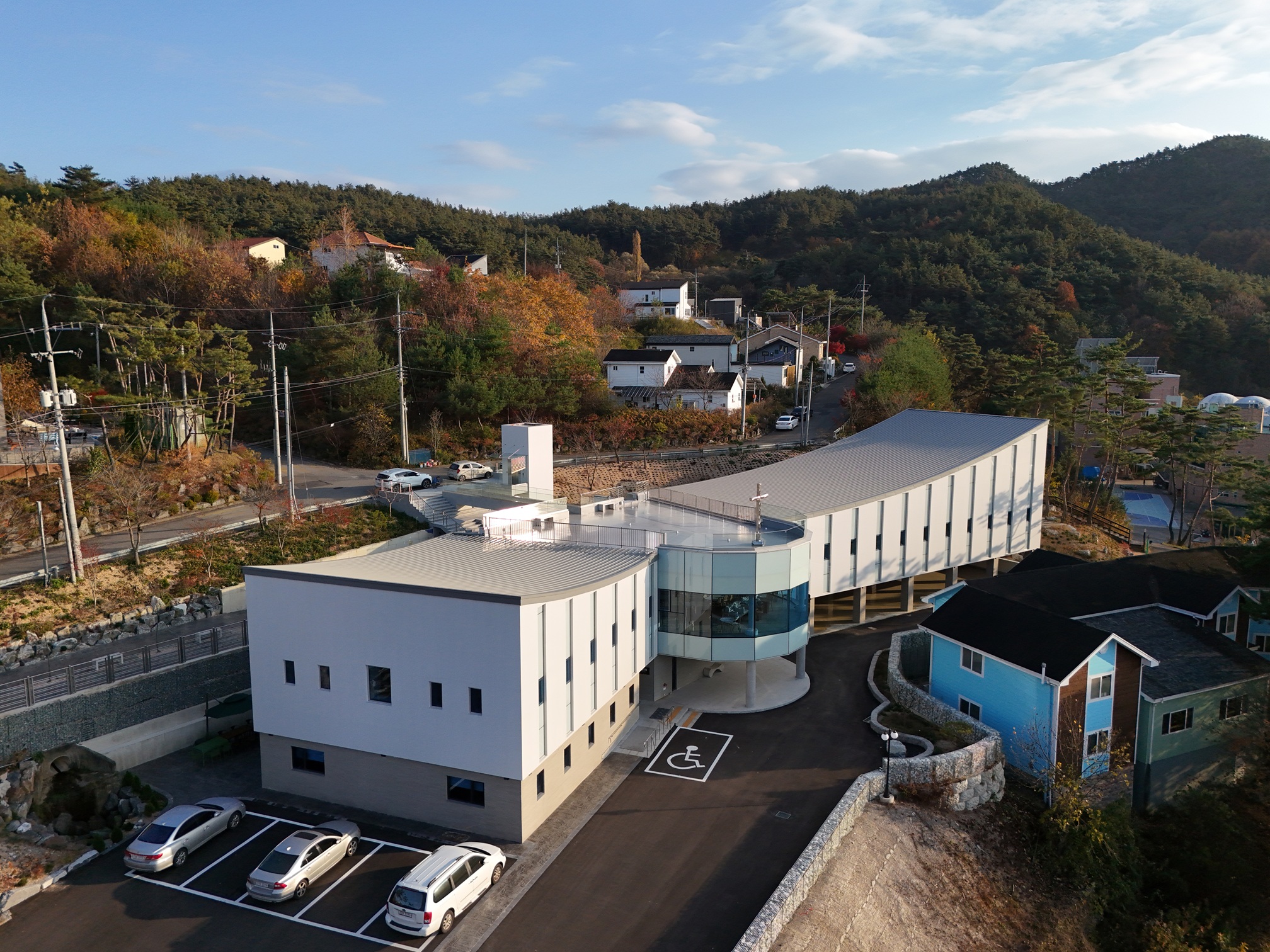 The site sits at the heart of a village carved into a hillside, with a dramatic level difference of 8.5 meters between the upper road and the lower flat ground. From the busy upper road, the view is pure nature—only the mountain and the sky. Before I realize it, my steps feel as if they are walking into the sky, toward God. Architecture led by nature. For this church, the most defining scene will not be the sanctuary inside, but the rooftop—directly accessed from the road—where the presence of Byulmurri Church is most clearly felt.
