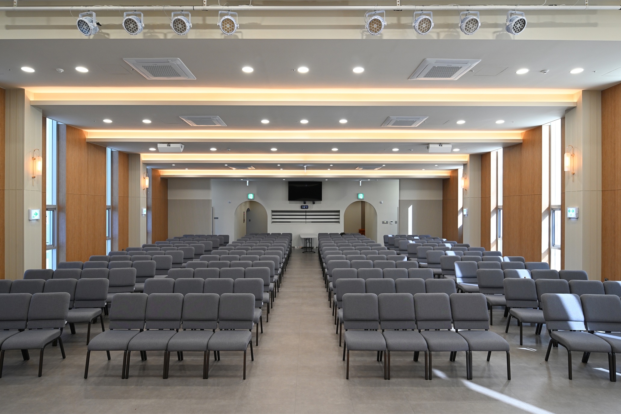 On the second floor facing the central entrance, a rounded café is planned as a place for communication, rest, and exchange—enjoying the open view ahead. The main sanctuary is placed to the south, while a library-like church memorial hall is set to the north, clearly separating the two functions. The first floor contains small group rooms and office spaces. To reinforce the embracing gesture, the two side masses rotate inward by about 17 degrees toward the center.