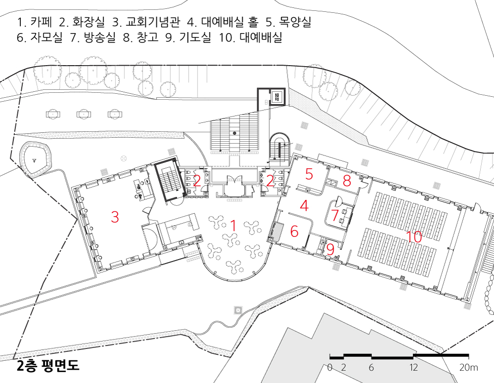 윗 도로에서 외부계단을 따라 내려가면 2층 주출입구를 만난다. 출입구 전면에는 비 안 맞는 외부공간을 계획하여 마치 작은 무대처럼 소모임, 연주활동 등 취미공간으로 활용할 수 있게 계획했고 계단은 야외 관람석으로 이용이 가능하다. 중심의 출입구에 면한 2층에는 라운드 형태의 카페를 계획하여 전면의 전망을 즐기며 사람들의 소통과 쉼, 교류공간으로 계획하였다. 또 남측엔 대예배당을, 북측엔 도서관 같은 교회기념관을 계획하여 두 가지 용도를 적절히 분리하였다. 1층은 소모임, 사무 공간 등으로 구성하였고 양측 매스는 안아주는 듯한 느낌이 들도록 중심을 향해 17도 가량 회전시켰다.
