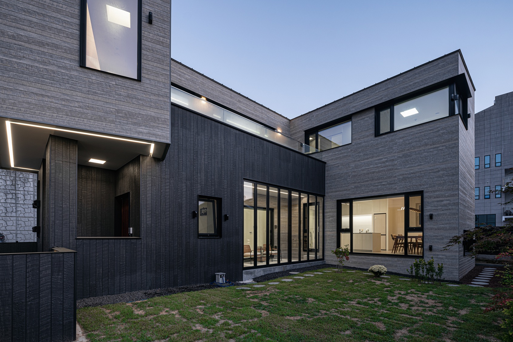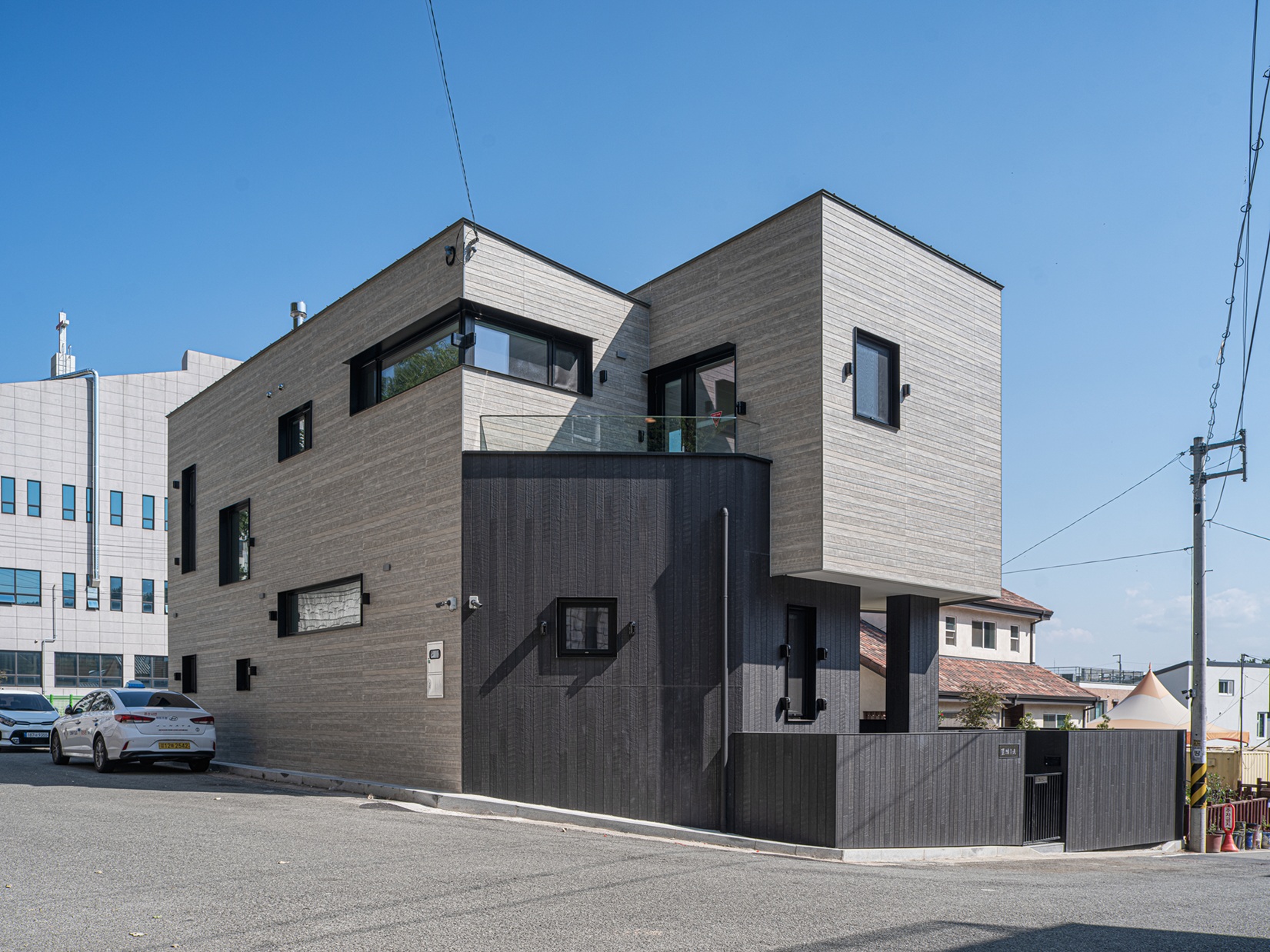 경산 사동의 주택가, 이 집은 묵직한 존재감으로 서 있다. 짙은 차콜빛의 목재 질감 위에 밝은 회색의 면이 얹혀 있는 형상은, 마치 대지 위에 단단한 바위가 뿌리내리고 그 위로 가벼운 구름이 머무는 듯한 풍경을 자아낸다. 도로를 향해 무심한 듯 등을 돌리고 서 있는 이 견고한 등은, 복잡한 주변 환경으로부터 은퇴한 건축주의 느린 시간을 지키겠다는 약속과도 같다.