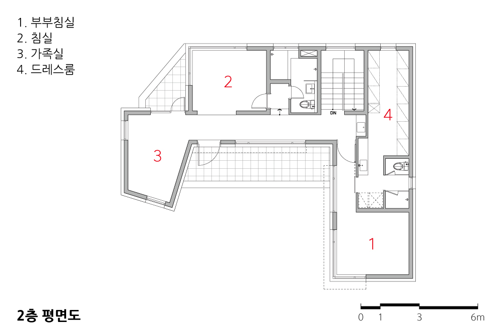 부부 침실은 가장 깊은 곳에 자리하여 편안한 안식을 돕는다. 2층의 백미는 볕이 잘 드는 ‘가족실’과, 1층 거실의 높은 층고를 활용해 조성된 ‘툇마루 형식의 방’이다. 마을 건너편 녹지를 정확히 응시하는 이 툇마루 방은 1층 마당과는 또 다른 사색적인 풍경을 선사한다. 또한, 외부로 돌출된 가족실 매스는 자칫 정적일 수 있는 외관에 리듬감을 부여하며 흥미로운 조형적 오브제로서의 역할을 수행한다.