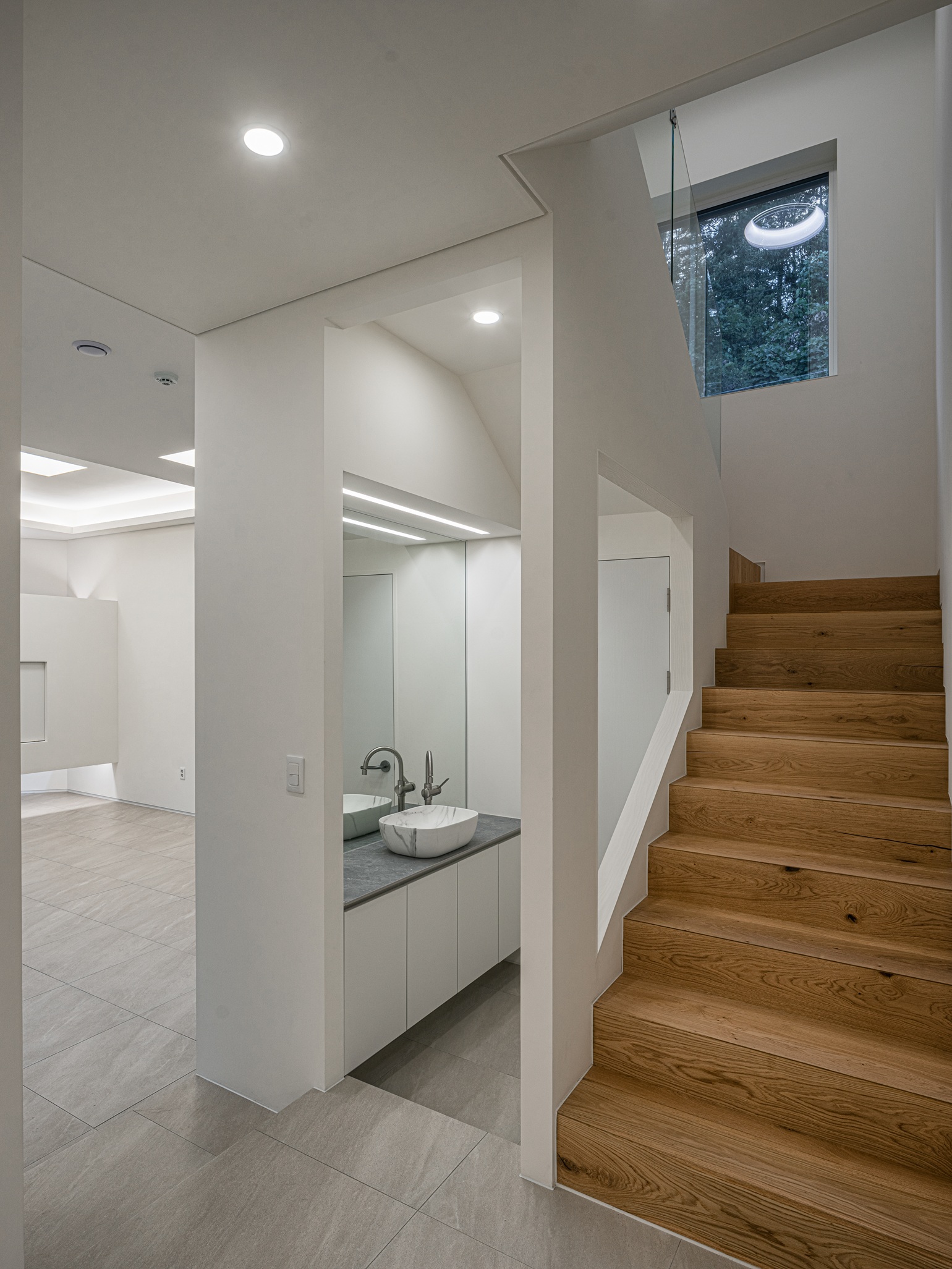 도로변 파라펫 라인 뒤로 완만한 경사의 박공지붕을 숨겨두어, 모던한 ‘플랫 루프(Flat Roof)’의 조형미를 유지하면서도 우수 처리와 단열이라는 기능적인 요구를 해결했다. 지붕의 선마저 파라펫 뒤로 겸손하게 숨기며, 집은 오로지 자신의 내면에 집중한다.