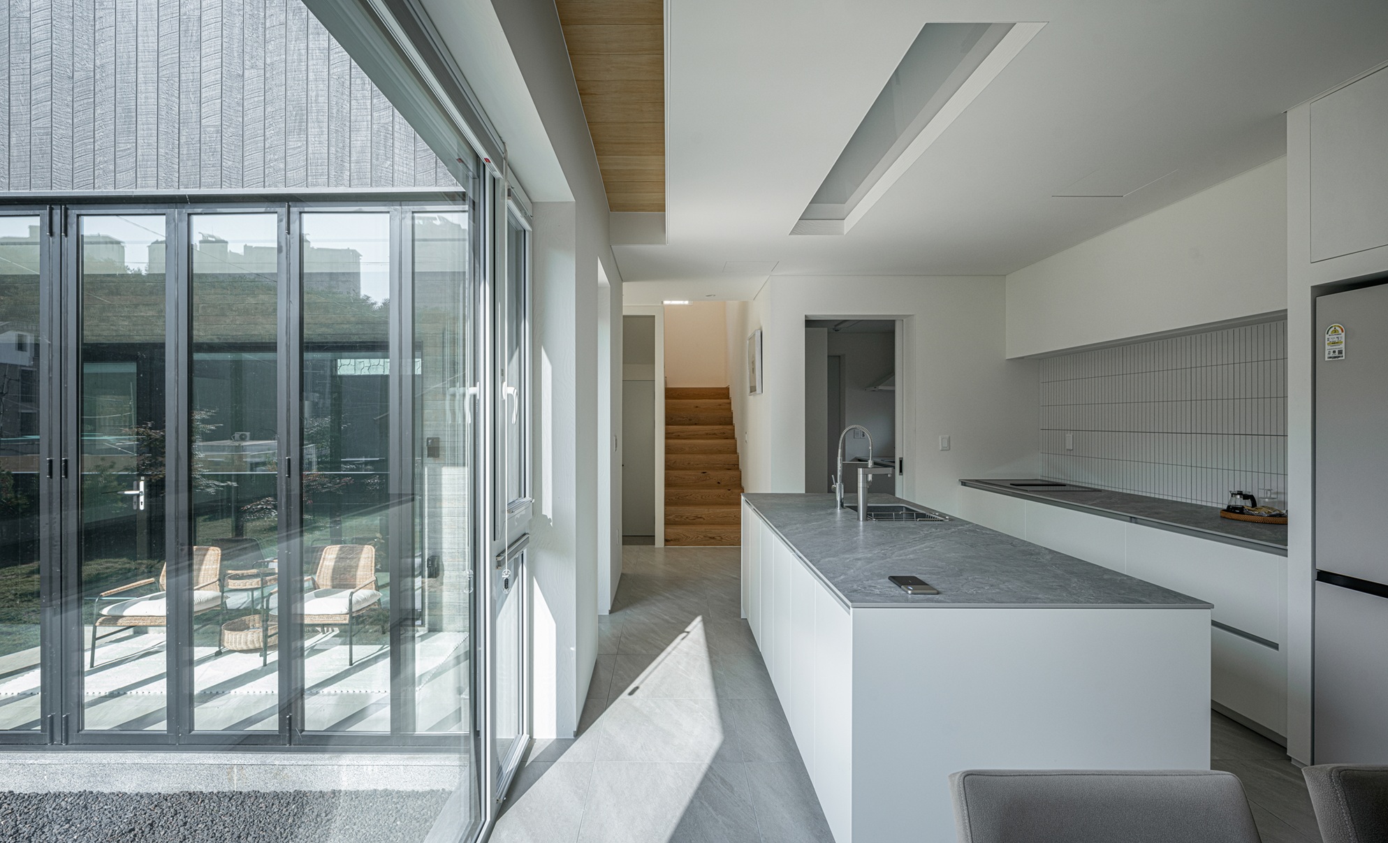 현관을 지나 내부로 들어서는 순간, 집은 감춰두었던 따뜻한 속내를 드러낸다. 밖에서는 철저히 닫혀 있던 시선이 안마당을 향해서는 투명하게 열린다. ‘ㄱ’자(L-shape)로 대지를 포근하게 감싸 안은 배치는 오롯이 건축주만을 위한 하늘과 마당을 담아낸다. 시간과 계절의 흐름에 따라 매일 다른 표정을 짓는 마당은 담장 너머와는 다른 세상, 즉 건축주만의 소우주(小宇宙)가 된다.