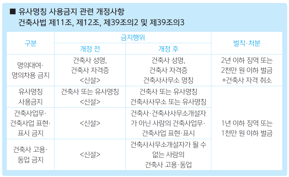 유사명칭 사용금지도 마찬가지이다. 현행 ‘건축사 또는 유사명칭’에서 ‘건축사 또는 유사명칭’과 더불어 ‘건축사사무소 또는 유사명칭’이 신설됐다. 물론 ‘건축사’ 유사명칭 사용 금지는 기존 법률에도 규정하고 있었다. 다만 위반 시 100만 원 이하의 과태료라는 제재수위가 경미한 수준에 그치고 있었는데, 이번에 형사처벌(1년 이하 징역 또는 1천만 원 이하 벌금)할 수 있도록 개정돼 실효성을 확보할 수 있게 됐다.
