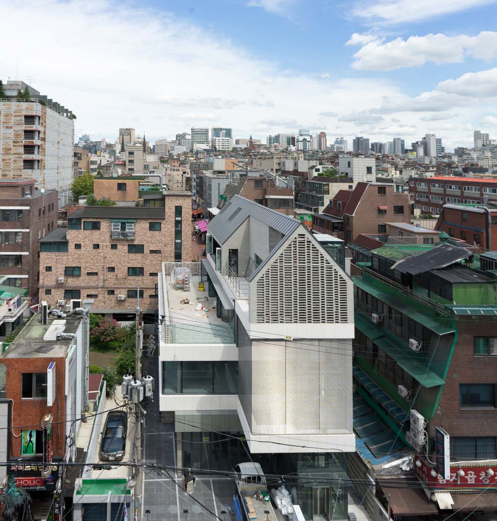 홀스빌딩은 거리의 인파와 건축이 만나는 방식에 대한 고민에서 시작되었다. 외부공간 은 상업공간의 가치를 더하는 중요한 곳으로, 매력적인 요소로 루프탑도 계획됐다. 1층은 도로에서 물러나 활용도가 높은 외부공간을 형성하고, 3층은 정북일조 규정을 활 용하여 옥상정원을 제공한다.