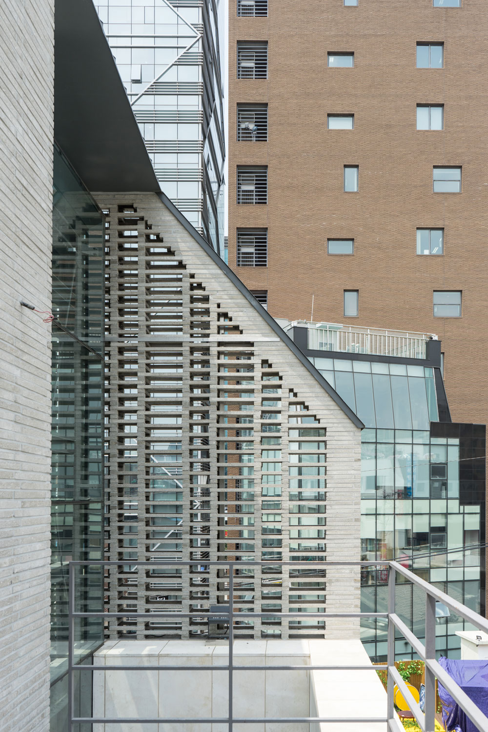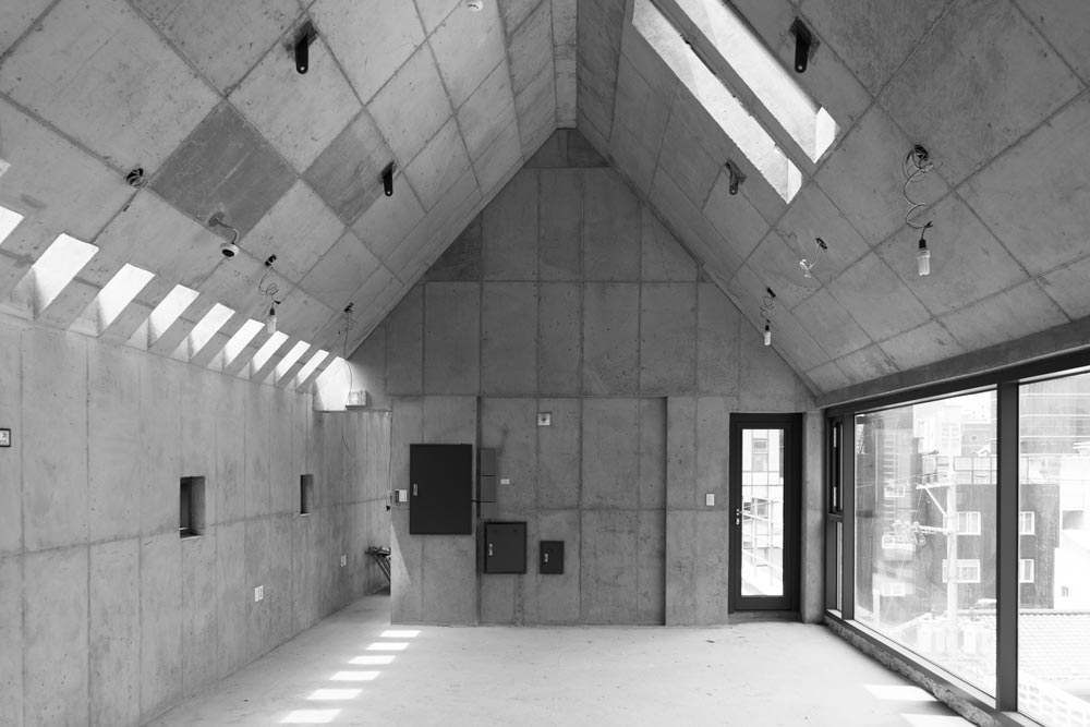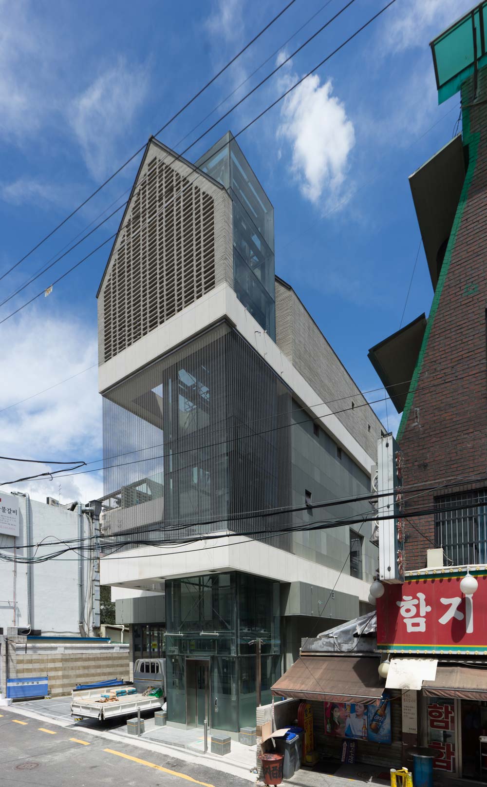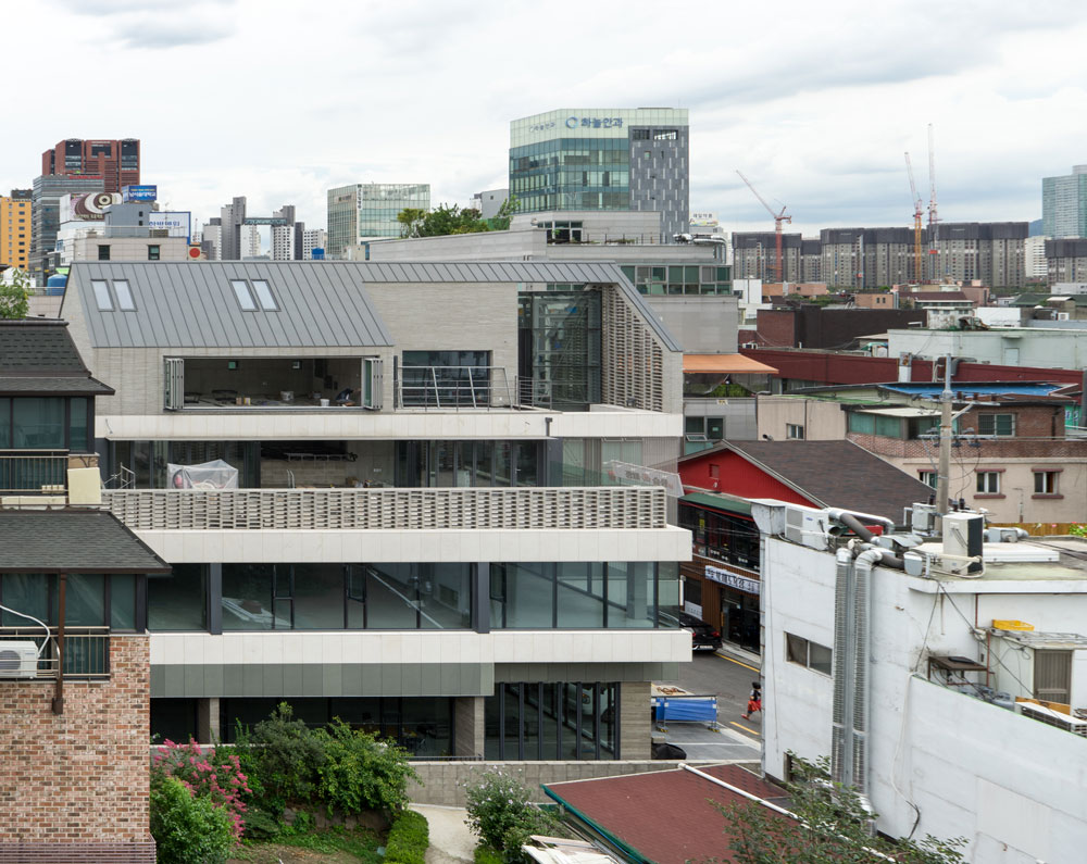 상대적으로 층고가 낮은 2층은 외장재를 1층 일부까지 연장하여 도로에서 건축물을 볼 때 인지성과 층고의 착시가 느껴지도록 했다. 2층부터 4층까지 엘리베이터를 감싸는 캔 틸레버는 보이드를 형성하여 미세한 구멍들로 이루어진 메탈패브릭과 함께 건물에 입체 감을 부여하고, 바람과 시선에 따라 출렁이며 독특한 거리 풍경을 만들어내고 있다. 4층 은 박공의 형태로 구성하여 일조사선을 극복하고 도로변으로 돌출시키는 전략을 취했 다. 자연채광을 끌어들이기 위해 수직벽과 박공이 만나는 부분에는 창호를 위한 구멍들 이 계획됐다.