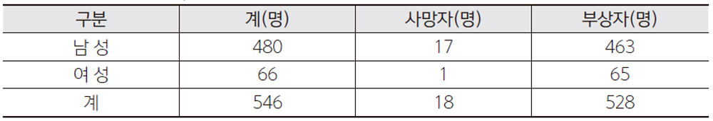 매년 한국전기안전연구원에서는 전기사고에 관련한 통계자료를 발표한다. 감전에 의한 사망과 부 상자에 대한 통계이다. 몇 년 전 까지는 통계 안에 젠더비율이 적용되지 않았으나 최근자료에는 남 성과 여성의 사상자의 비율을 통계하기 시작하였다. 감전사고는 사고형태, 전압의 종류, 장소, 설 비, 젠더별로 다양하게 발생한다. 발표된 사고 자료를 통해 안전한 환경을 조성할 키를 찾아낼 수 있을 것으로 판단하며 몇 개의 통계자료를 나열해 보겠다.