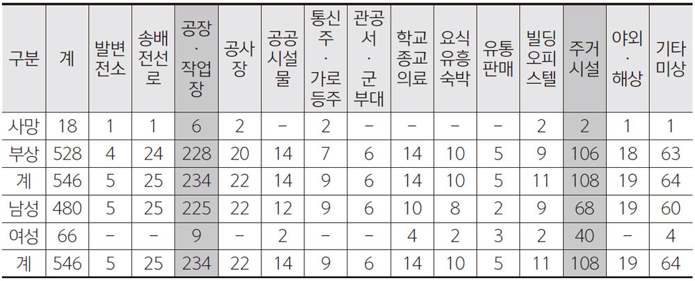 표 5.에서 감전사고로 인한 사망자와 부상자의 수가 남성이 여성보다 많다. 그러나 이 통계자료로는 여성이 남성보다 안전하다고 말할 수 없다. 실제로 위험에 노출된 작업을 남성이 많이 하기 때문에 사고율은 남성이 높다. 남성에 비해 적지만 여성의 사고율을 관과 할 수는 없다. 서두에 말했던 것처 럼 더 많은 대상이 안전할 수 있는 환경을 만드는 일이 젠더혁신이다. 그렇다면 위의 통계자료를 통해 여성이 가장 감전되기 쉬운 장소는 어디일까? 충전부에 직접접촉이 쉬우면서 220V를 사용하 는 주거공간인 것을 알 수 있다.