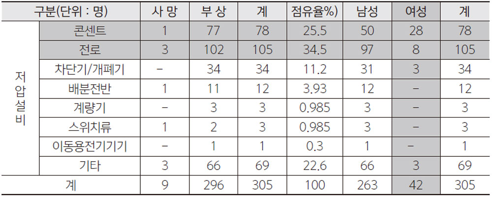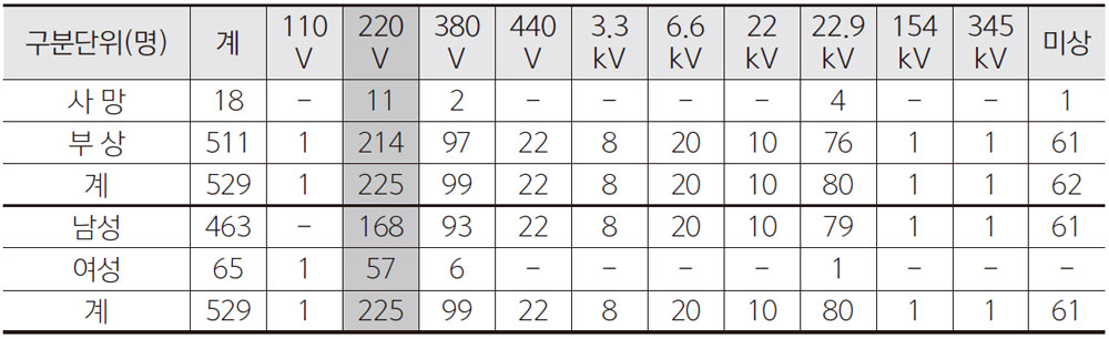 표 2.는 전압별 감전사고의 통계인데 사망과 부상자의 수는 220V에서 총 사상자 225명중 남성이 168명, 여성이 57명으로 나타났다. 국내의 표준전압 중 수용가에서 기술자가 아닌 일반인이 접할 수 있는 전압은 교류(AC)220V이다. 사고는 사용자의 접근이 빈번이 일어나는 장소에서 발생확률이 높다는 뜻이다.