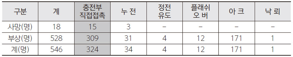 감전의 유형은 충전부 직접접촉, 누전, 정전유도, 플래쉬오버, 아크, 낙뢰 등 다양한 유형으로 일어 난다. 표 1. 은 감전사고 발생형태에 따른 통계인데 충전부 직접접촉에 의한 사고가 전체의 59.3%로 가장 많은 비율로 나타났다. 즉, 감전사고 발생형태 중 작업자나 사용자의 직접적인 신체나 손의 터 치에 의한 감전사고율이 높다는 것이다.