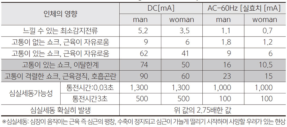 여성과 남성의 감전전류에 대하여 살펴보자. 표 6.에서 통전에 의한 인체반응을 나타낸 것이다. 사 람마다 신체조건이나 건강생태에 따라 차이는 있으나 이 표에서 여성이 남성보다 감전에 취약한 것을 알 수 있다. 이 수치를 기준으로 각국의 전기 시스템의 안전전류 기준이 되고 있다. 표는 어느 정도의 전류가 인체에 흐르면 감전될 것인가를 정리한 것으로 호흡이 곤란한 정도의 고통이 격렬 한 쇼크전류는 남성은 23mA, 여성은 15mA이다. 고통이 있는 이탈한계전류는 남성은 16mA, 여성은 10.5mA이다. 즉, 여성이 남성보다 낮은 전류에 감전된다는 것이다. 국내의 주택용 누전차단기 감도 전류는 일반장소는 30mA, 젖은장소는 15mA로 정해져있다. 일반장소는 30mA이상, 습기가 많은 장 소는 15mA이상 누전이 될 때 누전차단기가 동작하여 전류를 차단한다. 필자는 이 수치를 젠더관에서 생각해보기로 한다. 어딘가에서 누전이 되었다고 가정한다면 차단기가 동작하지 않는 누설 전류에 접촉 시 여성은 안전하지 않다는 것이다.