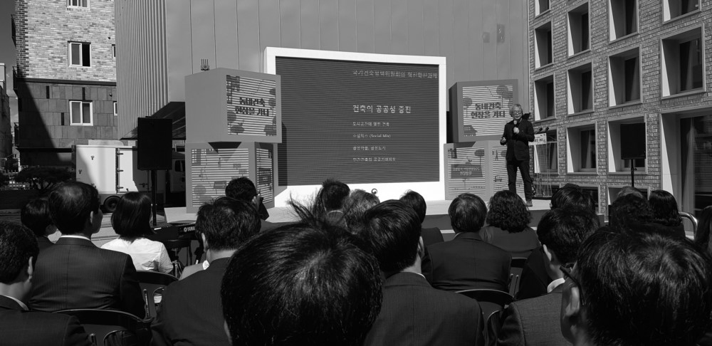 승효상 국가건축정책위원장은 이날 행사에서 ‘총괄건축가, 공공건축가, 국가건축정책위원회, 디자인 관리단 운영’으로 새로워지는 동네건축을 구현해나갈 것을 밝혔다. 또 국가건축정책위원회의 혁신확 산과제 3가지를 마련해 발표했다. ▶ ‘건축의 공공성 증진’을 위한 도시공간에 열린 건축, 소셜믹스, 공유마을 및 공유도시, 민간건축의 공공기여제도를 ▶ ‘설계방식 개선’ 방안으로 가격입찰제 등 설계 발주제도 혁신, 도시재생 등 지역개발사업의 공공건축 설계 정상화, 주민 중심 설계확대를 ▶ ‘설계관 리시스템 구축’을 겨냥한 총괄건축가 및 공공건축가제도 확산, 공사과정에 설계자 참여 보장, 건축교 육 및 건축사자격제도 개선, 건축허가제도 개선을 추진해나간다는 방침이다.