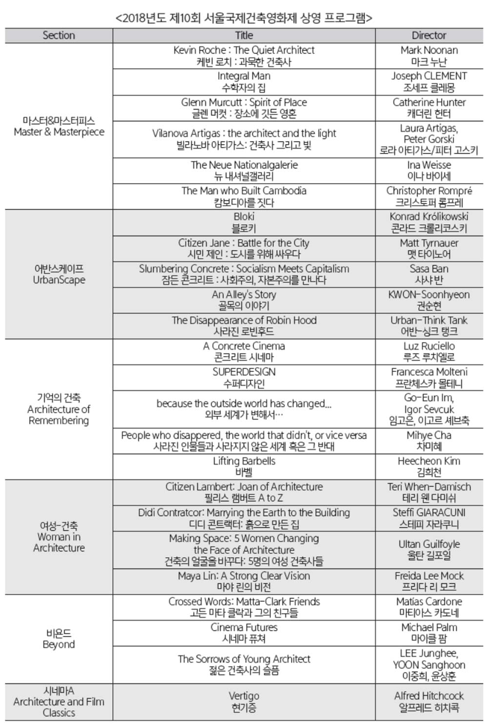 대한건축사협회가 주최·주관하고 국가건축정책위원회, 서울특별시, 영화진흥위원회, 한국건축단체 연합, 이화여자대학교에서 후원하는 이번 서울국제건축영화제는 ‘건축을 다시 생각하다(re THINKING ARCHITECT)’란 주제 아래 총 24편의 영화가 상영된다. 올해 영화제는 ▲ 마스터&마스 터피스 ▲ 어반스케이프 ▲ 기억의 건축 ▲ 여성-건축 ▲ 비욘드 ▲ 시네마 A 로 구분된 6개의 섹션 을 가지고 17개 국가의 중장편 18편과 단편 7편이 상영된다. 특히 섹션 ‘기억의 건축’과 ‘여성-건축’은 건축과 사회적 이슈, 미래 비전 등을 담아낸 테마로 올해 영 화제에서만 특별하게 마련된 섹션이다.