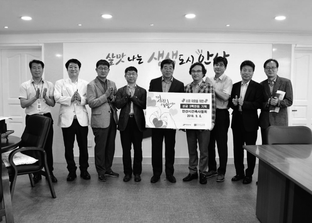 9월 10일 안산지역건축사회가 안산시청을 방문하여 사회적 약자에게 써달라며 후원금 300만원을 기 탁했다고 밝혔다. 안산지역건축사회는 회원 90명의 건축사가 가입돼 있으며, 겨울부터 불우이웃돕 기, 장학생 후원, 사회복지기관후원 등 기부활동에 앞장서고 있다.