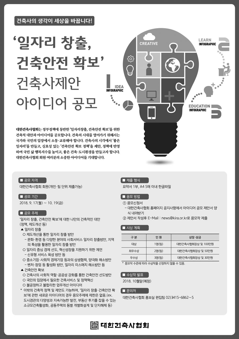 대한건축사협회가 일자리 창출과 건축안전 확보를 위한 아이디어 공모를 공고했다. 대한건축사협회 회 원이라면 누구나 ‘일자리 창출과 건축안전 확보에 대 한 건축적 대안’을 개인이나 팀 단위로 제출할 수 있 다. 공모 기간은 9월 17일부터 10월 19일까지이다. 대한건축사협회 홈페이지 공지사항에서 아이디어 공 모 제안서 양식을 내려받아 요약서 1부와 A4 5매 이 내로 제출하면 된다.