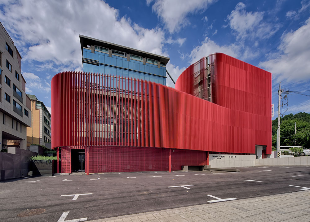 홍성용 건축사가 제안한 것은 수직의 루버다. 루버는 원래 실내에 들어오는 빛을 조절하는 기능성으로 선택되기는 하지만, 규칙적으로 같은 형태가 반복되는 외관이 갖는 미학적 효과 역시 중요한 선택 동기가 된다. 건물 전체를 수직의 붉은색 루버들이 일정한 간격으로 촘촘하게 배치되었다. 루버의 길이는 다르게 적용되었다. 본관 건물의 경우 저층부는 완전히 가렸지만, 커튼월의 상층부는 드러났다. 반면에 관리동은 더 긴 루버로 완전히 감쌌다. 관리동을 완전히 감쌈으로써 일단 이 건물이 드러났을 때 갖는 시각적 분리 현상을 제거했다. 본관의 상층부는 유리로 마감돼 파란색 하늘과 자연스럽게 연결된다. 따라서 도로에서 봤을 때 이 건물은 간결하고 무엇보다 단일해졌다. 붉은색 루버 그리고 하늘과 연결된 유리, 이렇게 두 가지 표면만 남았다. 게다가 붉은색 루버가 강렬하게 시선을 끌어당긴다. 평범한 상가건물로 구성된 주변과 확실하게 차별화된, 패션 브랜드 사옥다운 표상을 이끌어냈다.