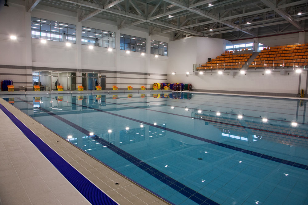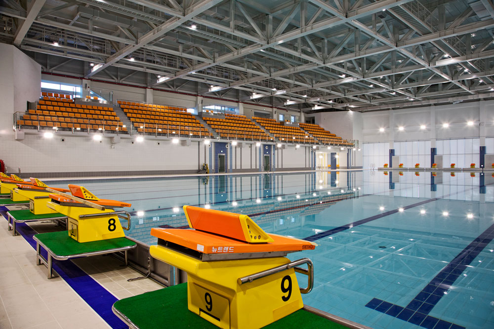 8레인의 수영장, 유아 강습전 물과 친숙해질 수 있는 공간인 옥외휴게(교육공간), 아이들의 강 습과정을 지켜볼 수 있는 맘스존, 수영 관련 행사 등의 전시가 가능한 전시공간, 필요 시 응원· 무대 공간 확보기능을 가진 가변형 스탠드 등으로 공간을 형성했다.