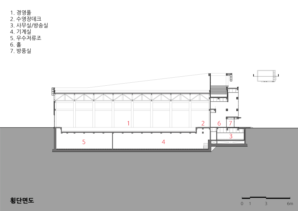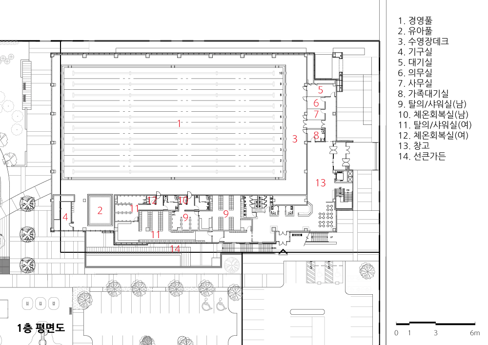 8레인의 수영장, 유아 강습전 물과 친숙해질 수 있는 공간인 옥외휴게(교육공간), 아이들의 강 습과정을 지켜볼 수 있는 맘스존, 수영 관련 행사 등의 전시가 가능한 전시공간, 필요 시 응원· 무대 공간 확보기능을 가진 가변형 스탠드 등으로 공간을 형성했다.