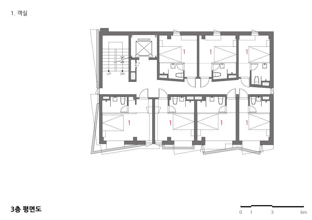 This project is to remodel the existing motel and to build one more floor to make it a tourist hotel in order to meet the lack of hotel demand due to the surge of foreign tourists. Due to the characteristics of the commercial area, the privacy was seriously infringed by the distance of about 2m from the adjacent building, the rooms were small and poor in addition to structural instability. By simply re-adjusting the size of the existing rooms, diversity of spaces with different widths and heights has been ensured, and structural reinforcement work has been carried out for a stable structure. Especially, I made a space of the exterior wall as a strategy to solve privacy. I tilted the existing exterior wall and turned the direction of windows. In the new exterior wall space, furniture such as computer was installed and the furniture was arranged, and it became a building with a dynamic appearance through a distorted outer wall. The interior corridor wall was also turned in the same direction as the outer wall, which made it easier to access each room. I tried different scenes by separating the colors of the wall.